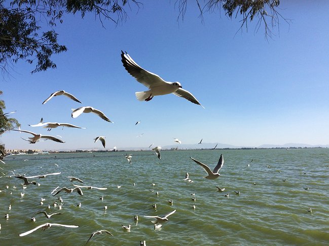 每年冬天,会有很多红嘴鸥从西伯利亚飞来越冬,海埂公园就成了看鸟和喂鸟的好去处。除此之外,池上还有很多海鸥飞舞,在此拍照观湖都是个 不错的选择。