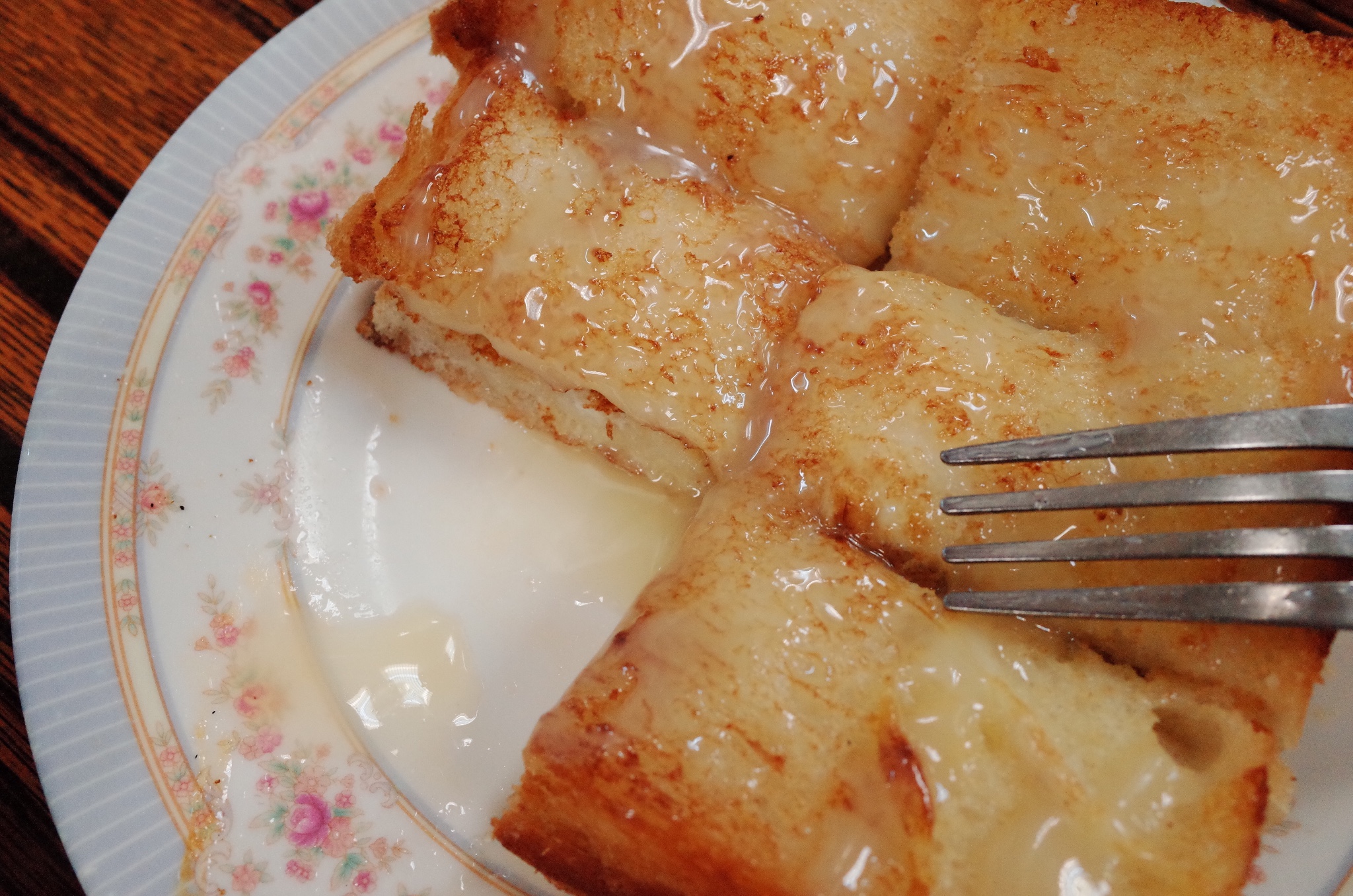 香港大大小小的餐厅几乎都会有西多士,只不过做法上略有不同。有的是用炸的,然后在上面放上牛油蜂蜜什么的,有的是把吐司中间换成咖央,自带甜味,瑞记则是用炼乳来做甜味剂的。