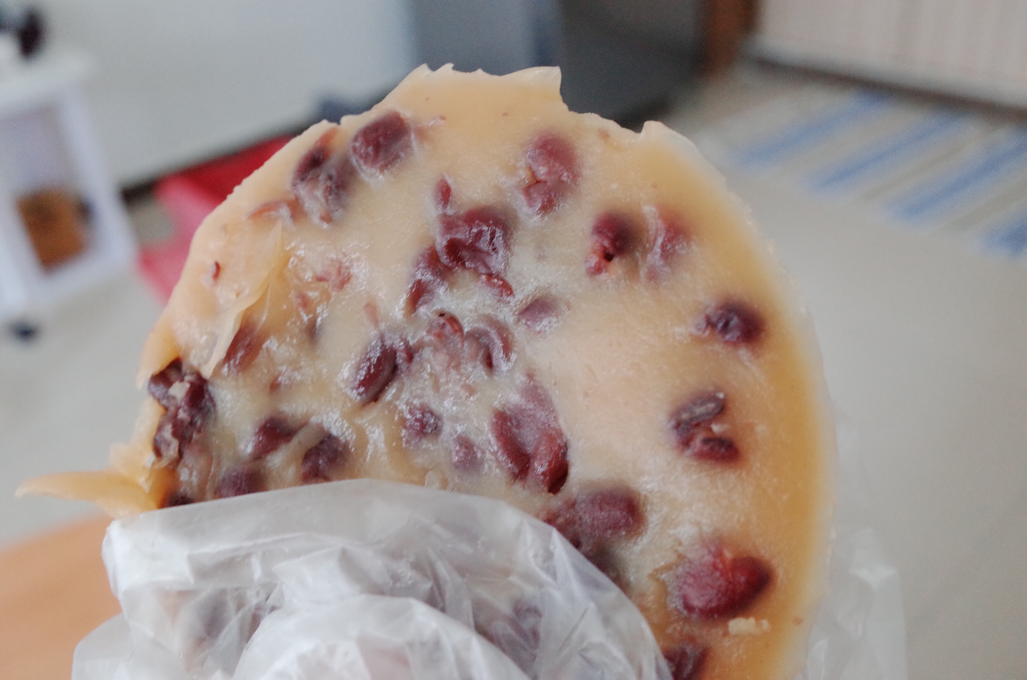 这是三样里我最喜欢的(可能因为是红豆爱好者的缘故)。红豆很多,微微甜,口感比钵仔糕和黑芝麻糕都要扎实一点,很有古早味的感觉。