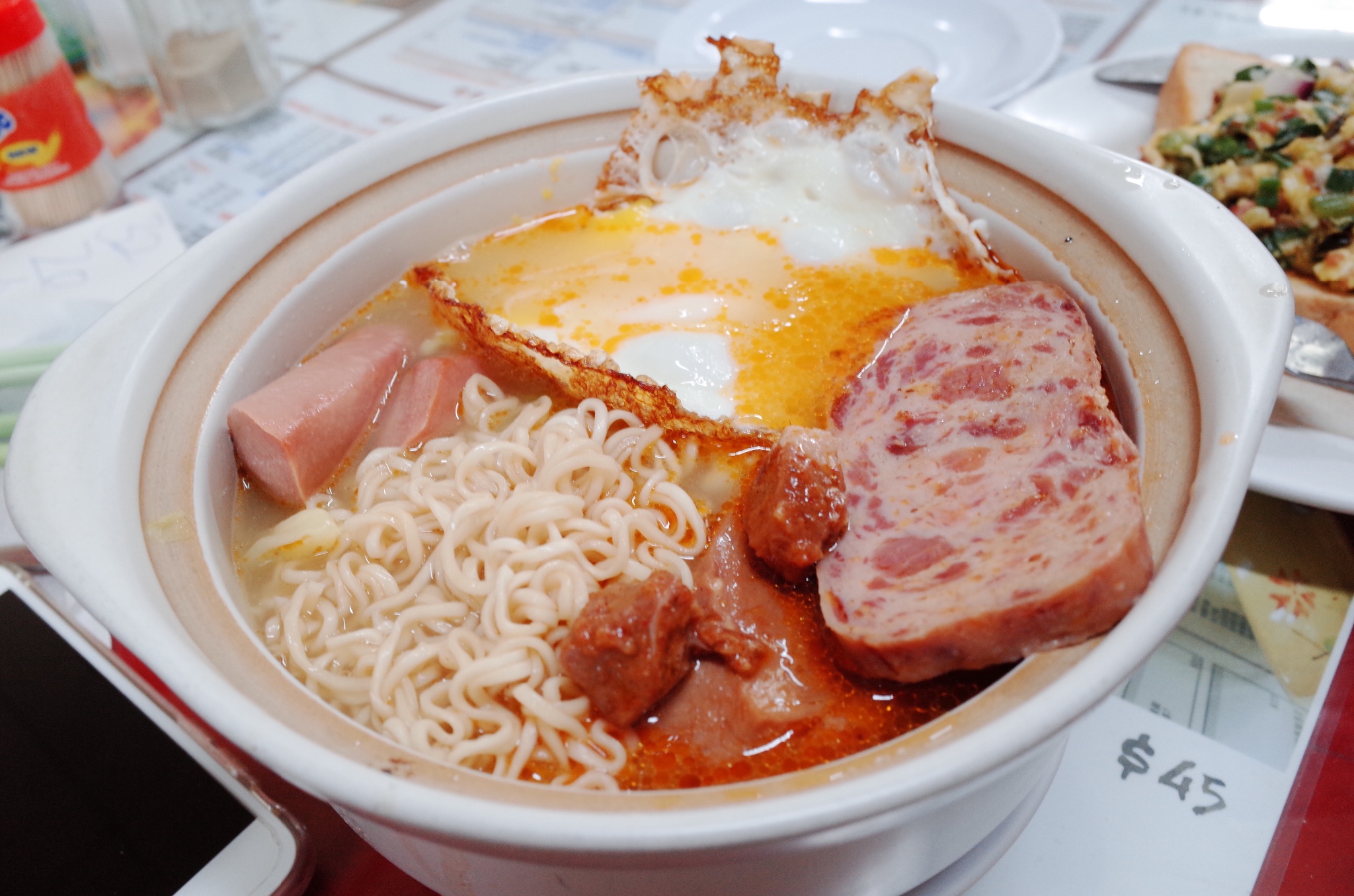 锅仔公司面端上来是一个小锅,里面有公仔面(也就是方便面),煎蛋,叉烧,火腿,午餐肉,鸭胸肉,内容还是挺丰富的,但是味道的话就普通了。(下次一定要去吃到叉烧捞面!)