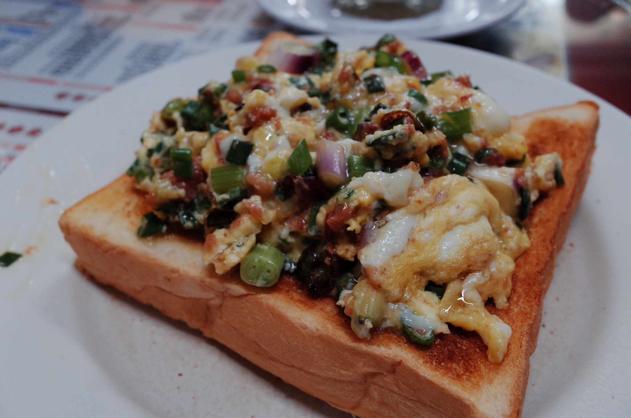 工作日是下午有供应,周末全天供应。烘过的厚吐司表面微脆,搭配炒的嫩嫩的蛋,咸咸的是好吃啦~(但是葱碎切的略大,容易把牛肉的味道盖过去)