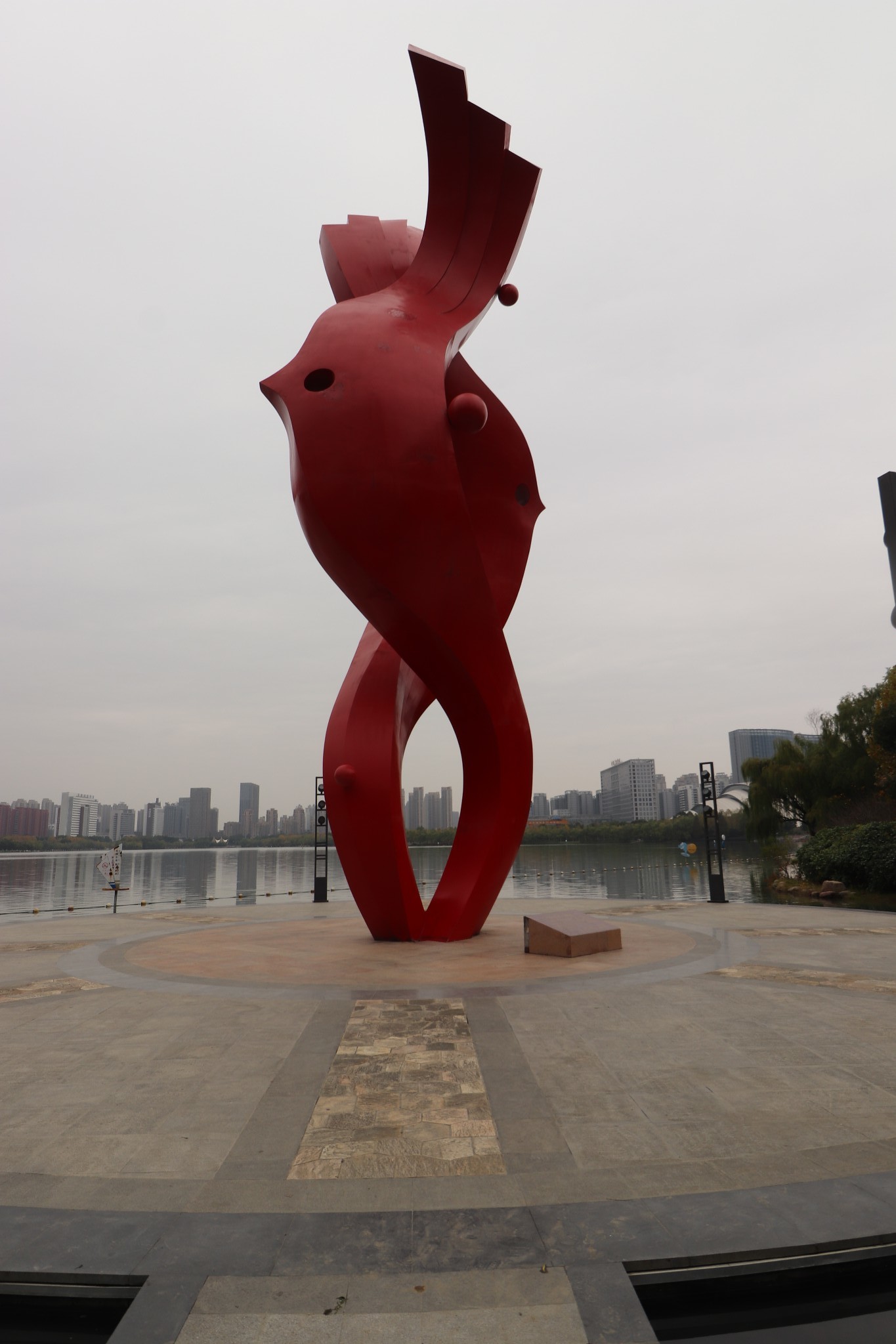 这个雕塑是湖边雕塑我唯一知道名字的,是叫军民鱼水情,红色的鱼和水的标志缠绕在一起,很容易理解。