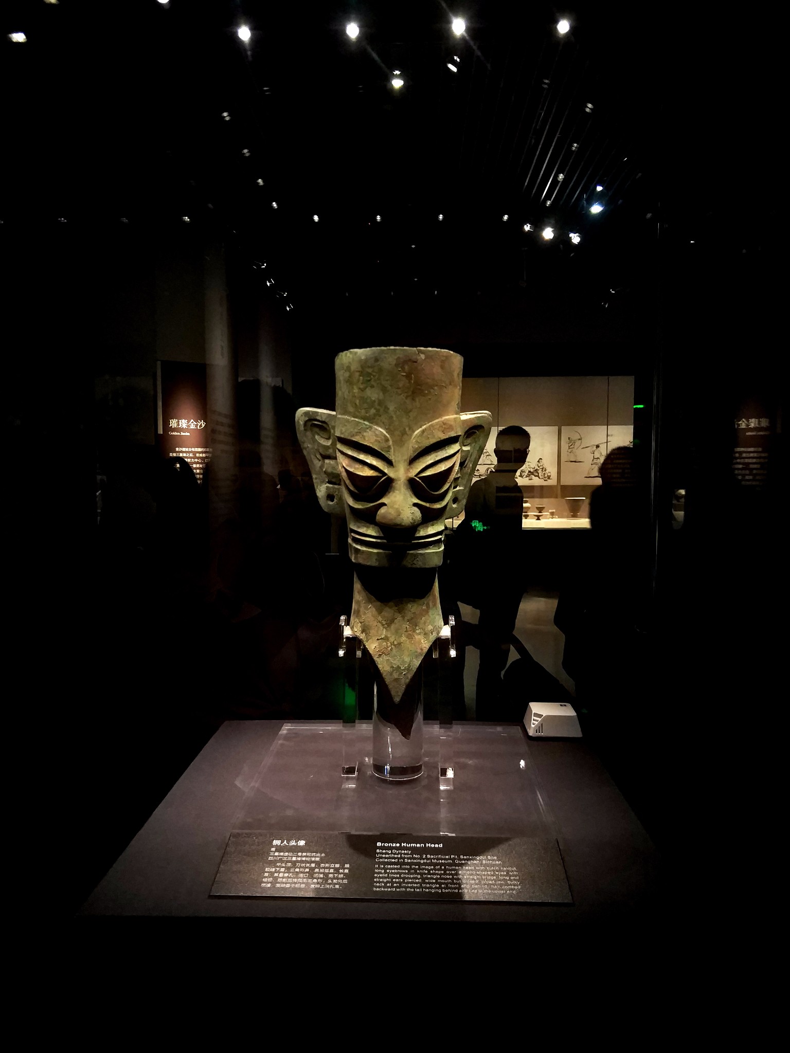 这个展示铜人头像的地方好像一个大展厅中的小展厅,两侧大屏幕环绕,持续的播放三星堆和金沙文物,在大屏幕下方有一些关于古属文物展示,这个铜人头像就展示在展厅的正中心。在远处看到他的时候好像人一样,在那里静静的注视着来往的游客。而我就站在这里看着大屏幕播放的画面,觉得特别有代入感,好像穿越到了那个年代一样。我也是久久不愿离去,同行的小伙伴说我在这里看的都入迷了。