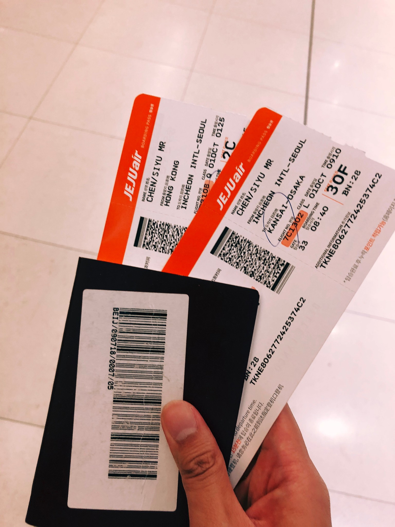 ——这里要提一个小插曲,我们是在【去哪儿网】订的济州航空“香港-首尔仁川-关西国际机场”的航班,由于要在首尔仁川转机,去哪儿网提示我们需要落地签证(也就是另外再办个韩国签证),这在我之前的旅行中是没有遇到过的。因为我们订的是联程航班(所谓联程航班就是两趟航班是同个航空公司,且在一张行程单上可以看到两段机票),联程航班一般是不需要过境签的。为此我们专门咨询了去哪儿的客服、济州航空的客服、以及韩国驻中国大使馆广州领馆的办公人员,济州航空的客服表示不知道,大使馆和去哪儿人员都异口同声地叫我们办理韩国签证……最后我们又咨询了帮我们办日签的旅行社小姐姐,她表示从未听说过韩国转机去日本需要办理过境签。再三确认最近和我们同样线路的旅客并不需要办理过境签后,我们决定相信小姐姐。事实上我们也是顺利过关的,根本没有遇到盘查,因为直接走的转机通道……只是不明白去哪儿和韩国大使馆人员为何执意要我们办理了。