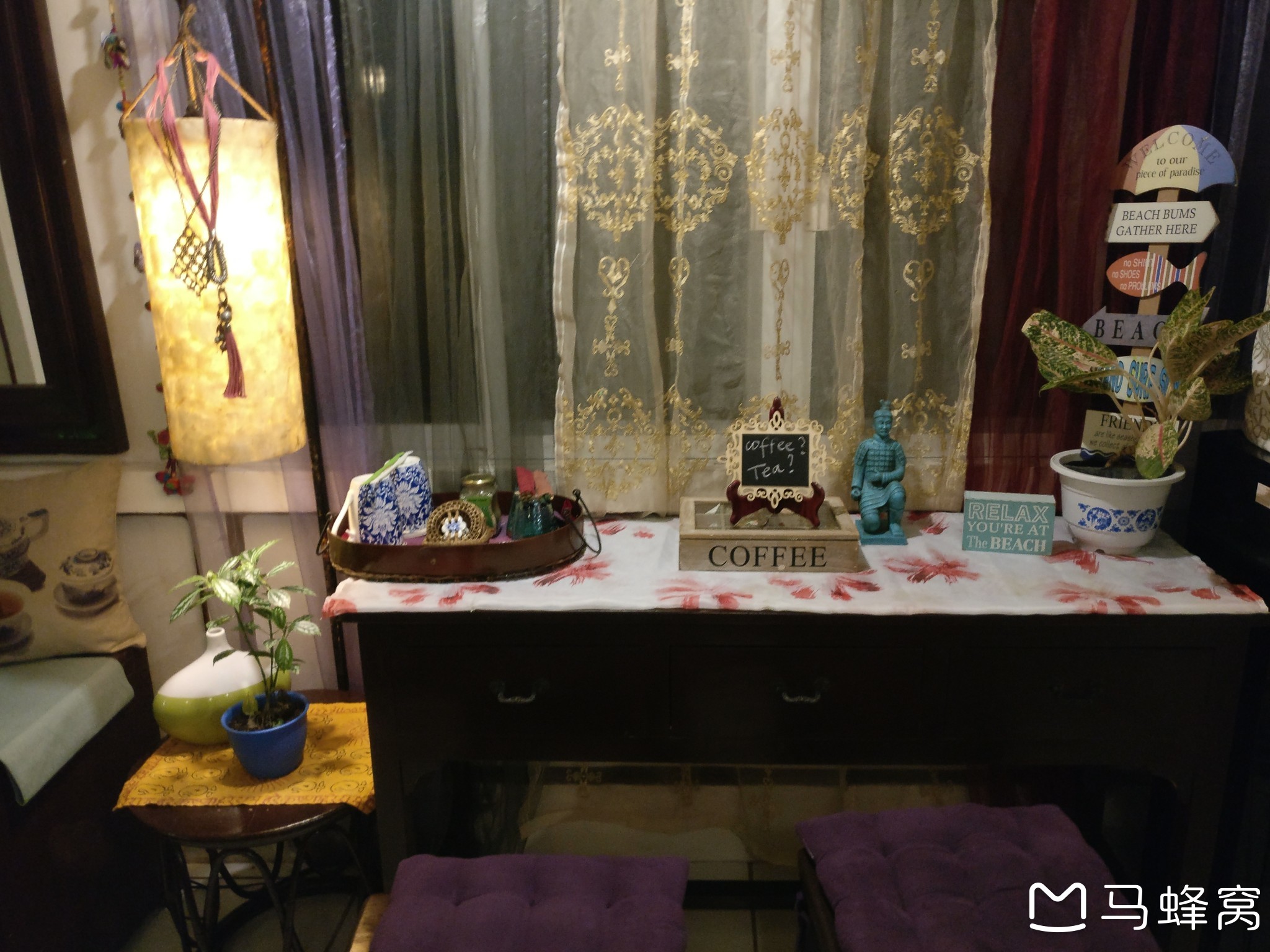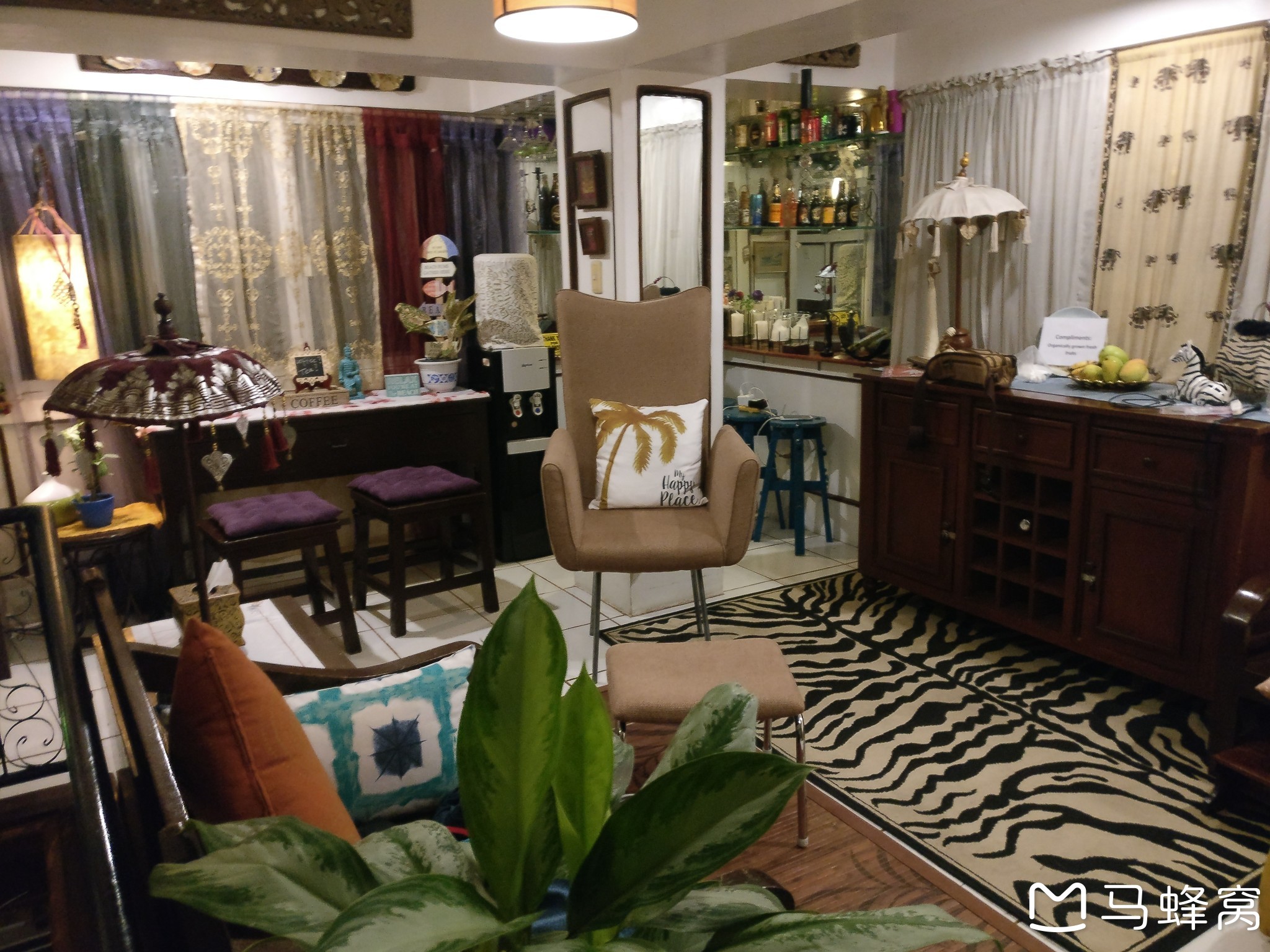 缺点:1.房间房间里有非常非常多来自各种国家的装饰品,看得出来主人也有认真布置过这里,然而因为东西太多风格不统一有些杂乱的感觉。2.厕所非常非常小,水是咸的(这个其实也能忍),有热水但是非常小。3.房间里有小蚂蚁。4.床感觉不是非常干净。5.充电插座少的可怜。6.只有一楼门口的小花园WIFI是最好的,在房间里几乎没有信号也没有WIFI。