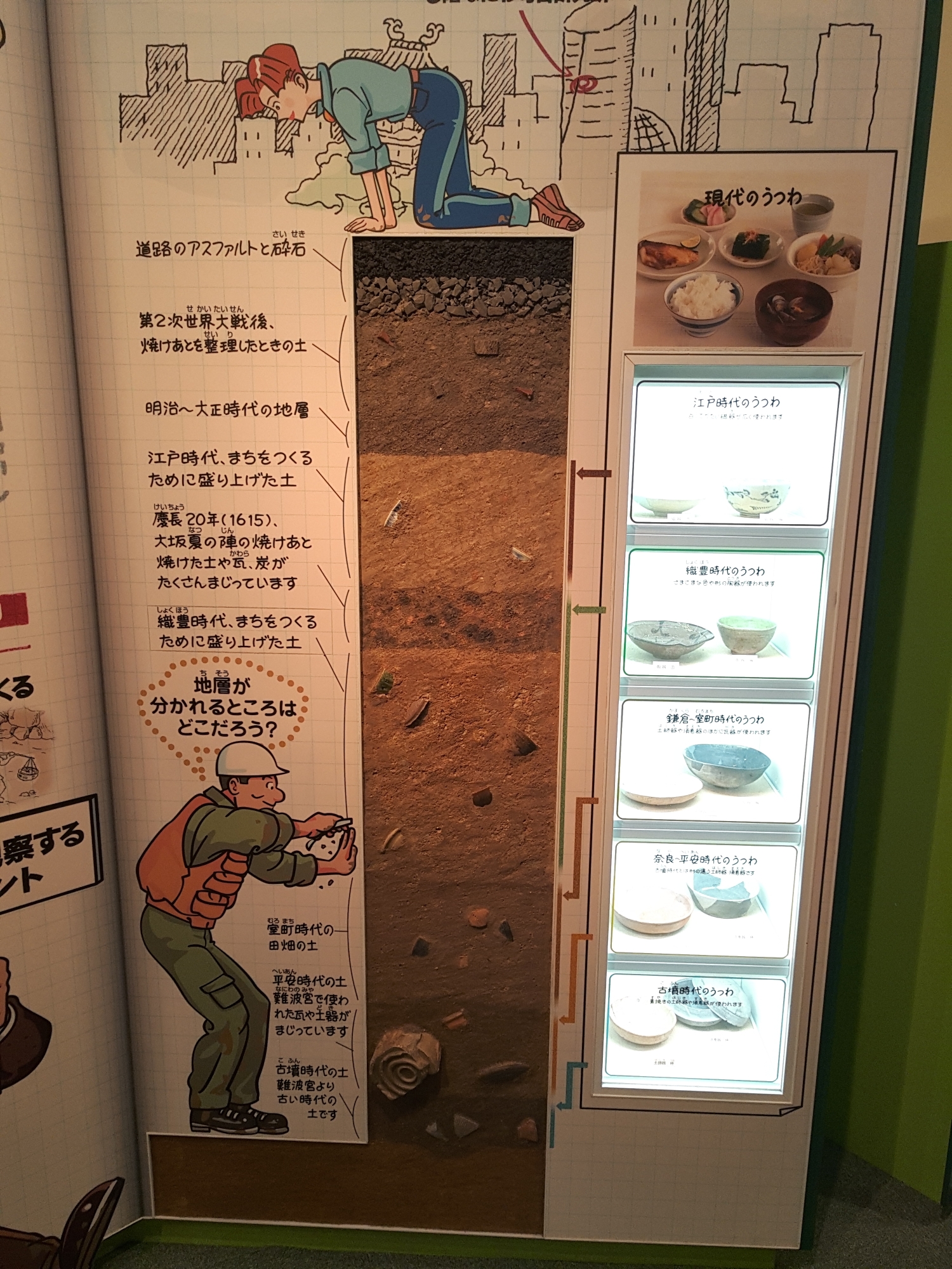 它的整个布展思路就和国内的博物馆非常不一样,并非原址改造,而是在大阪的众多历史古迹中间造了一幢高楼,这样在观看介绍时就可以从周围的落地窗俯瞰大阪各个历史时期建筑的原貌,体验非常新颖。而且六楼还有一个探索古迹的体验展区,可以自己体验考古的乐趣,很适合孩子玩,语言门槛也不高,基本看图就可以知道展览的内容,非常值得一去!
