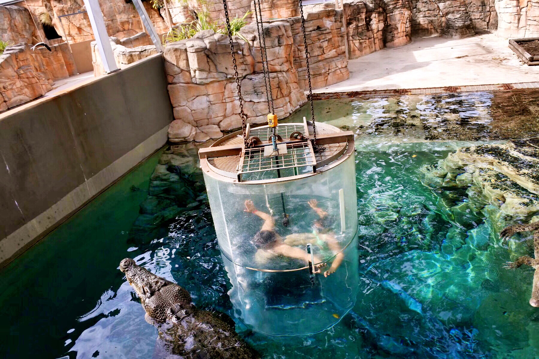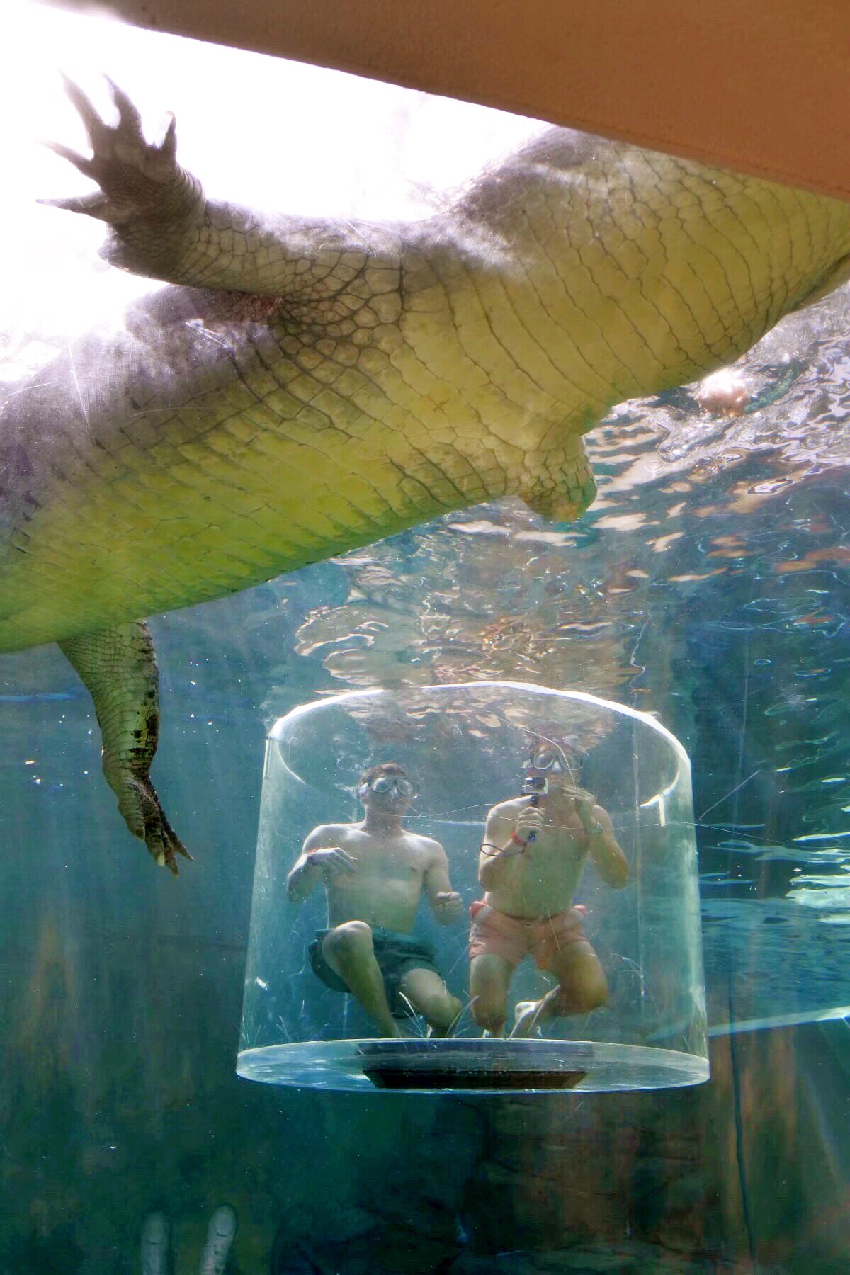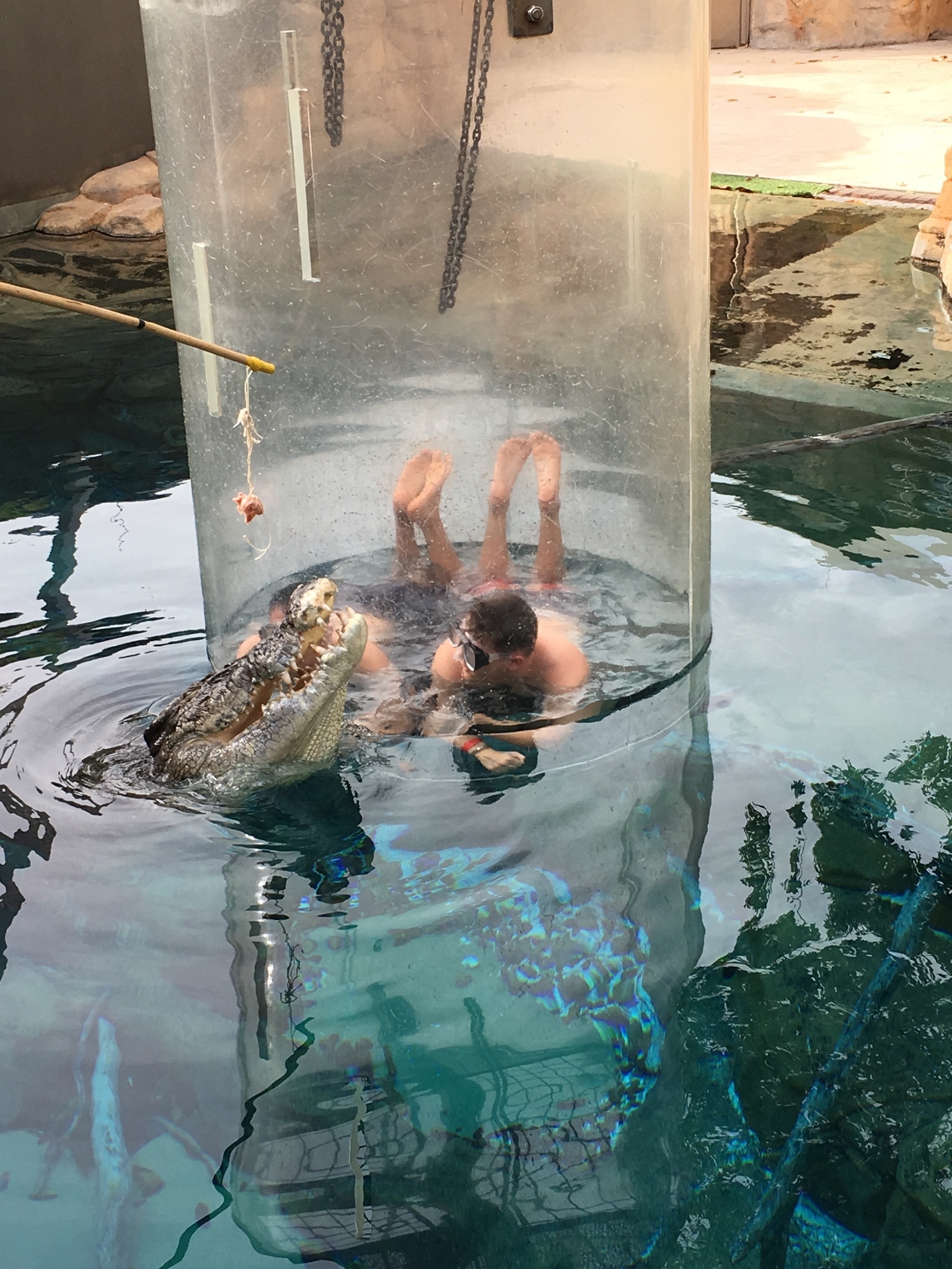 最多可以进入两名成年人。然后这个透明的笼子会缓缓进入鳄鱼池里。工作人员就是用各种血淋淋的生肉来诱惑鳄鱼靠近笼子,只为博笼中之人惊吓一叫