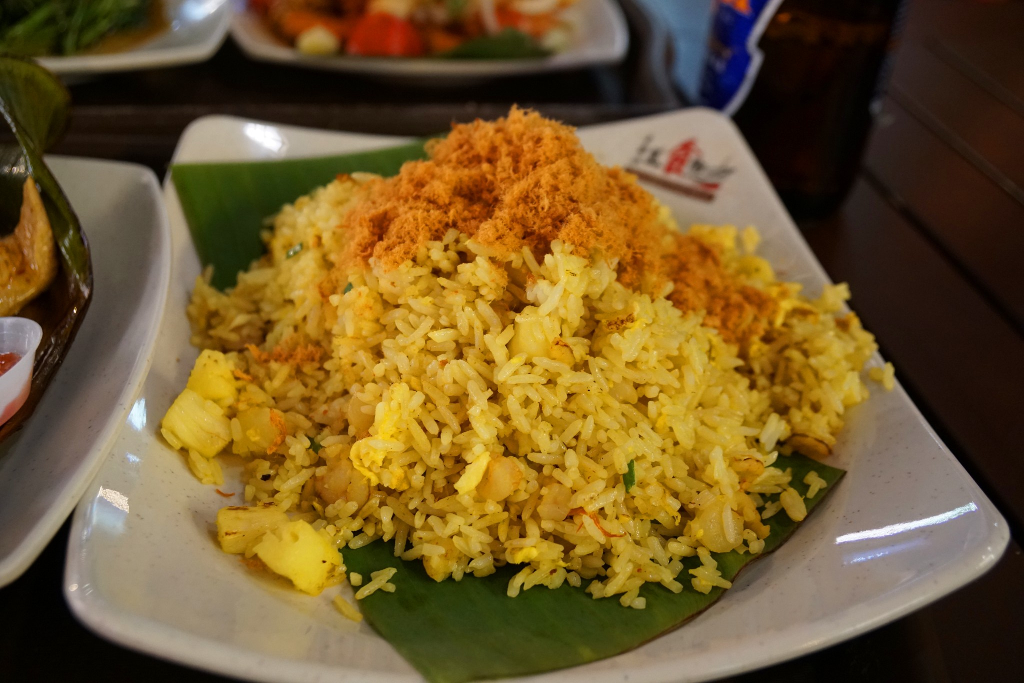 海鲜炒饭是传统的加了菠萝和虾仁的炒饭,上面撒了很多肉松,用勺子大口大口的送到嘴巴里面,酸,甜,香,鲜,这些元素在口中爆炸,并且有吃主食的强烈满足感。