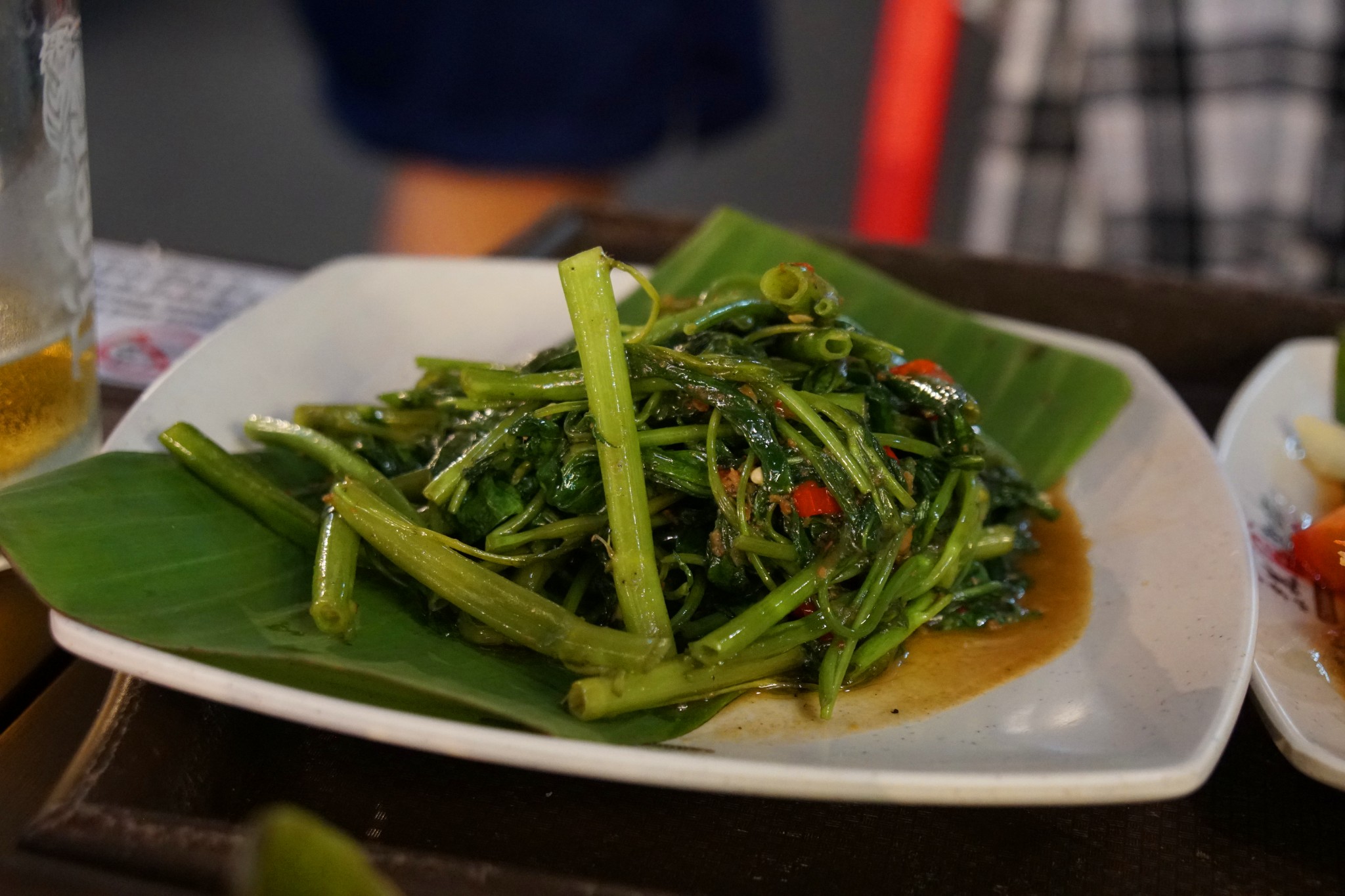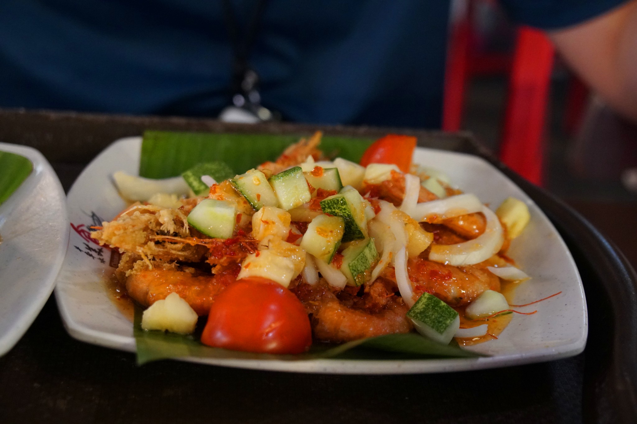 这个摊位基本在美食街中间位置。我俩找了两圈才发现这里。我们点了海鲜炒饭,酸甜虾,烤方鱼和酱炒空心菜。