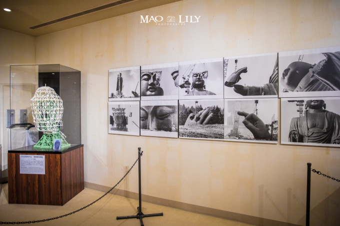 进入大佛内部是需要脱鞋参观的,工作人员会给你一个袋子装鞋。里面是两尊“大佛mini”,据说五十年过后会变成青铜色的大佛。大佛内共有5层,1楼观室是观想净土世界的空间,陈列着大佛的模型和照片,一一展示大佛的建造过程,感受建成的不易。