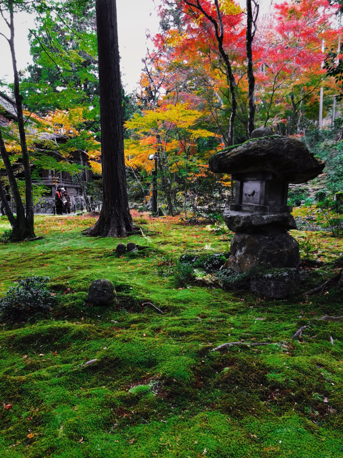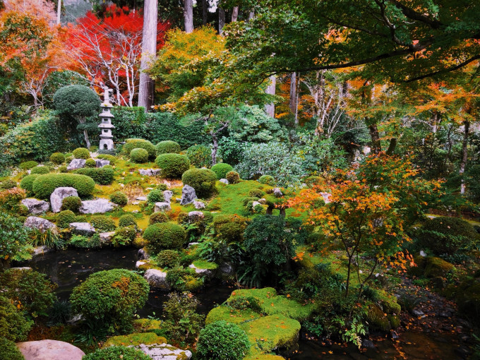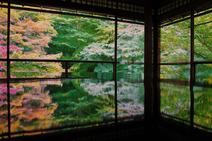 寺院很小,在半山坡上。从进入寺院的大门开始就是一步一景,从还未转红的青翠池塘小院走进室内,上二楼拍摄著名的镜像红叶景。