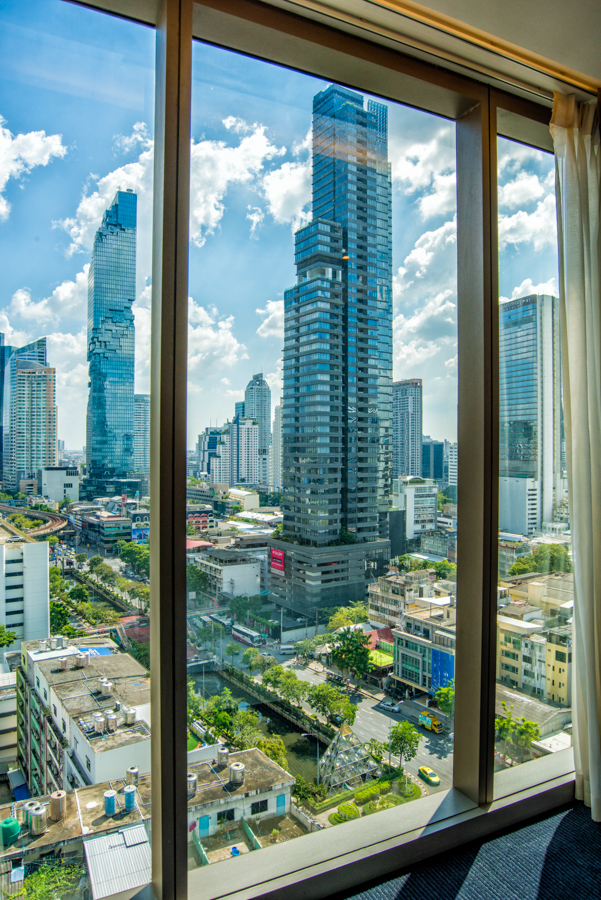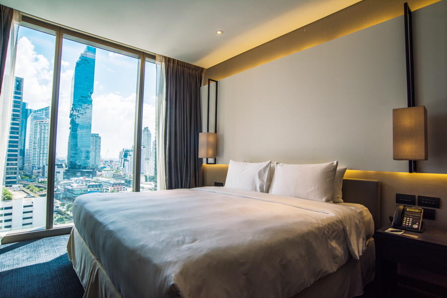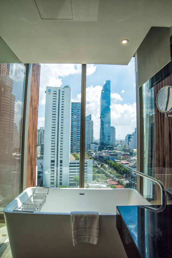 我们选的是18楼的浴室也带落地窗的Club room ,记住入住前最好给前台看一下照片确认,他们家club room还有另一边是没有落地窗的,主要是我们喜欢各种拍,所以光线和视线角度很重要,还有一早醒来在浴室里晒太阳泡澡是多浪漫呀……一进房间我就非常满意,房间的床非常大,目测可以睡四个人,大大的落地窗躺在床上就可以一眼看到远处的风景,曼谷有名的像素大厦此刻就在你的眼前,躺在床上各种摆出各种pose来与她合影。