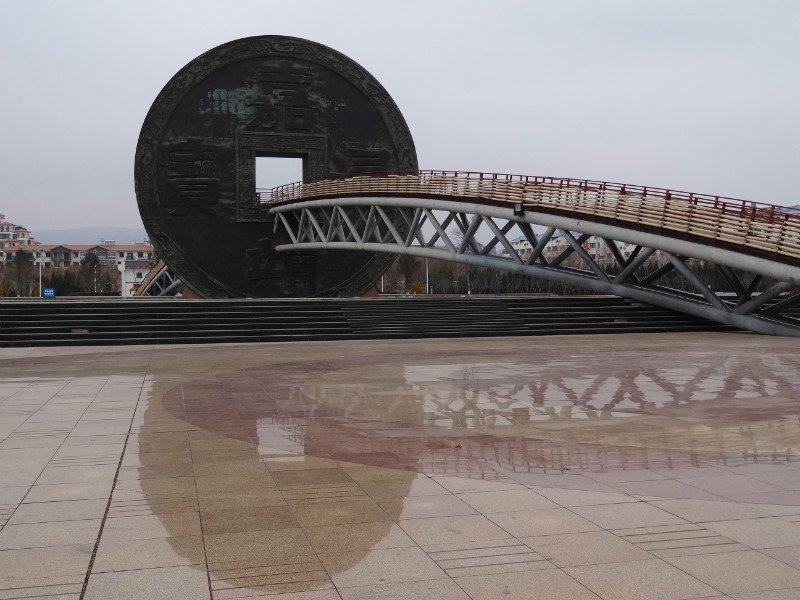 会泽 公园就是会泽 标志——“嘉靖通宝”是在原型基础上放大 39 倍而成,高 22.62 米,重 7777 公斤,120米长的彩虹桥,从嘉靖通宝方孔中斜穿而过。