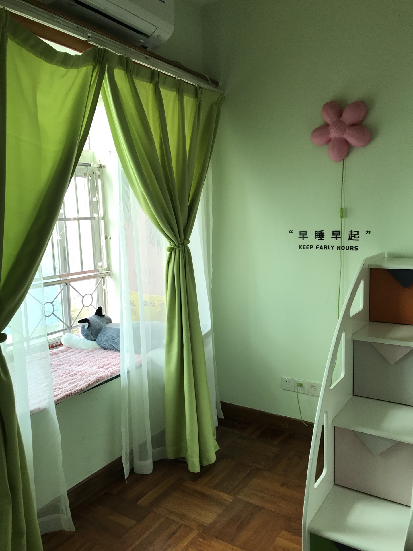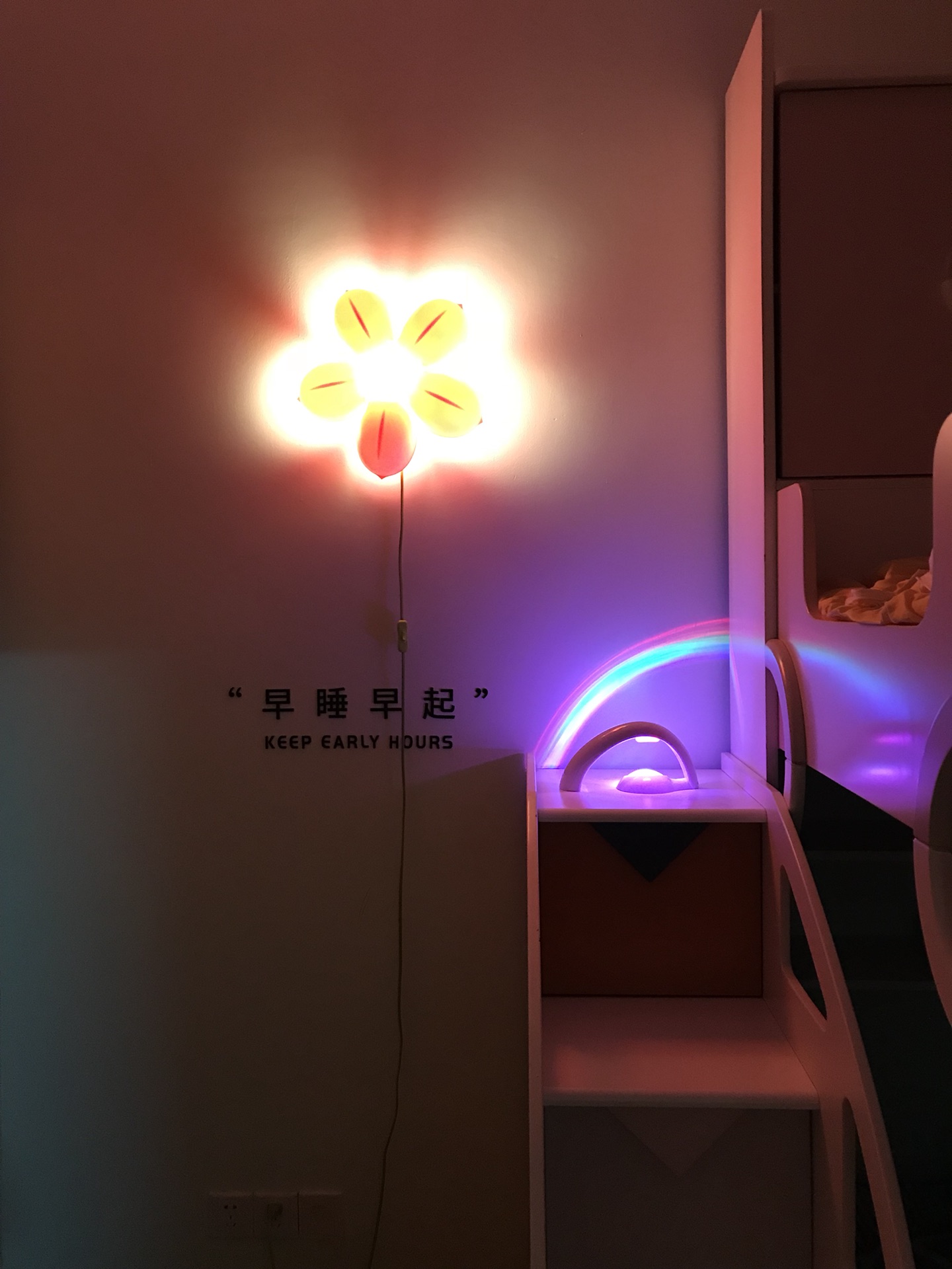 ,所以家里至少可以睡5个人。我跟房东沟通想稍早一点入住,房东也各种积极的协调,让我们11点就入住了。家里一进去就香喷喷的,阳台上晾着刚洗的床单被套,各种细节也做得比较到位,有各种可爱的玩偶,小朋友们很喜欢,有很神奇的彩虹灯,厨房可以做饭,三晚花费959,向大家推荐。