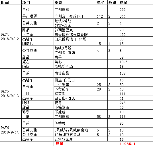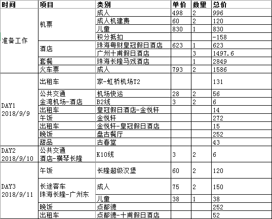 每次出游都有记账的习惯,明明白白,6天5夜三人一共用了1万2不到,主要是长隆、酒店和饮食方面是大头,像广州塔和珠江夜游提前买套票还是可以便宜一点。