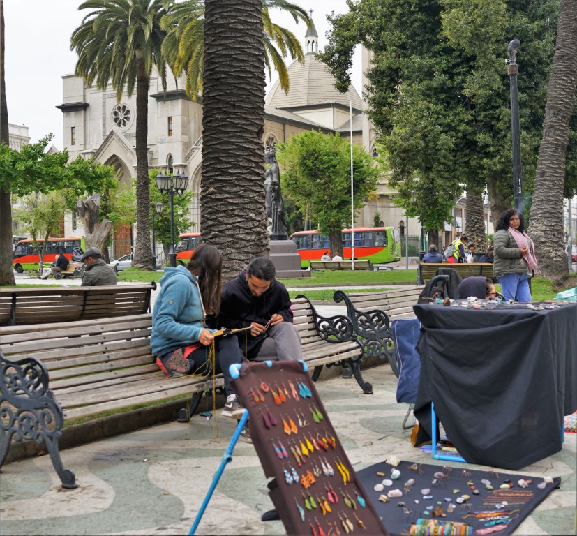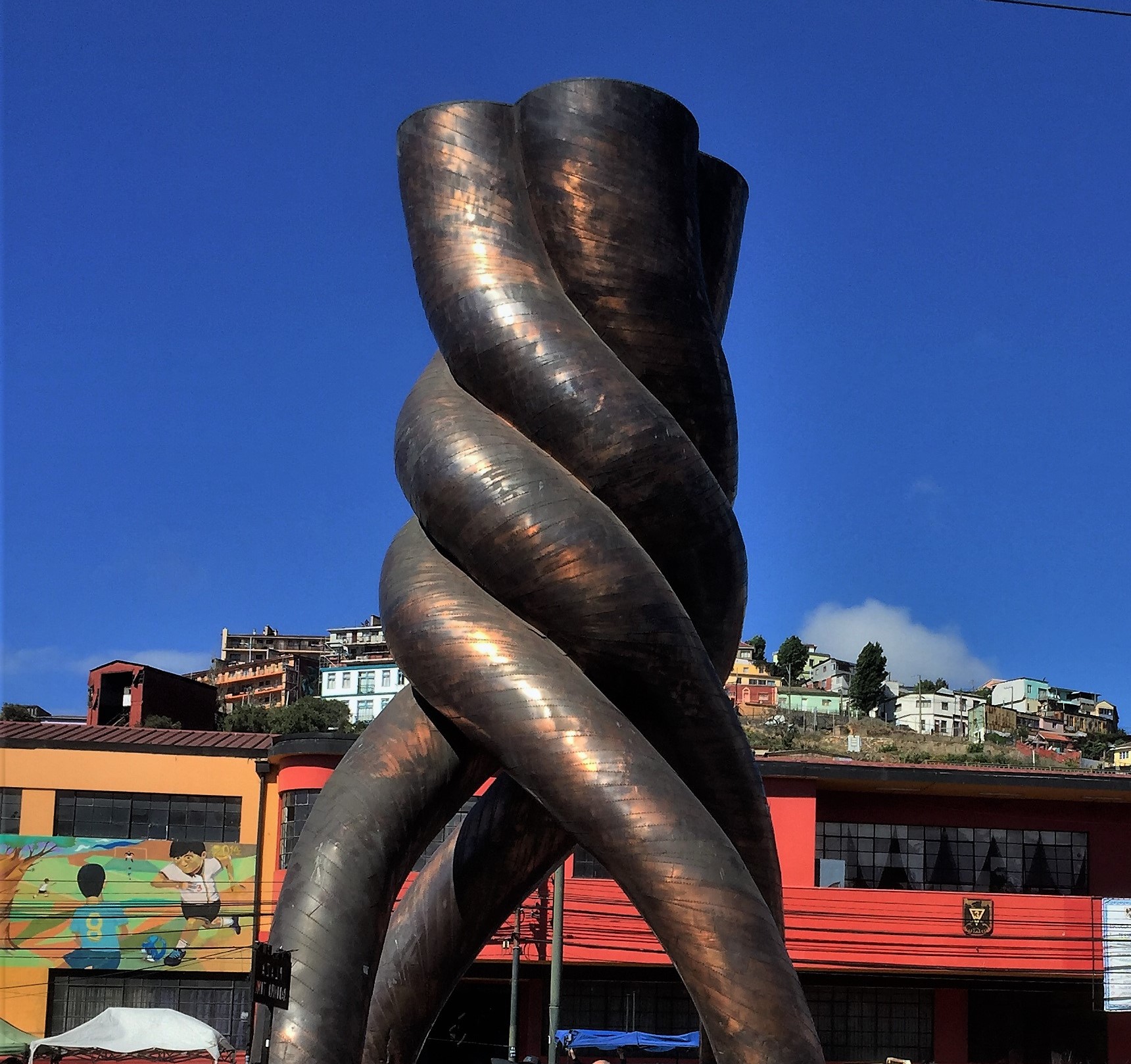 巴士总站旁边的马路中间,有一个铜雕:由4根巨大的铜管向上扭成一股绳。寓意:智利的四大政党联合起来,共同参与国家的管理。