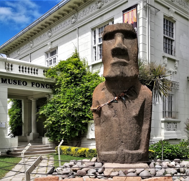 博物馆门口,矗立着一尊从复活节岛运来的巨人石像。它与大英博物馆里的那尊石像,是复活节岛以外,世界上仅有的两尊摩艾。