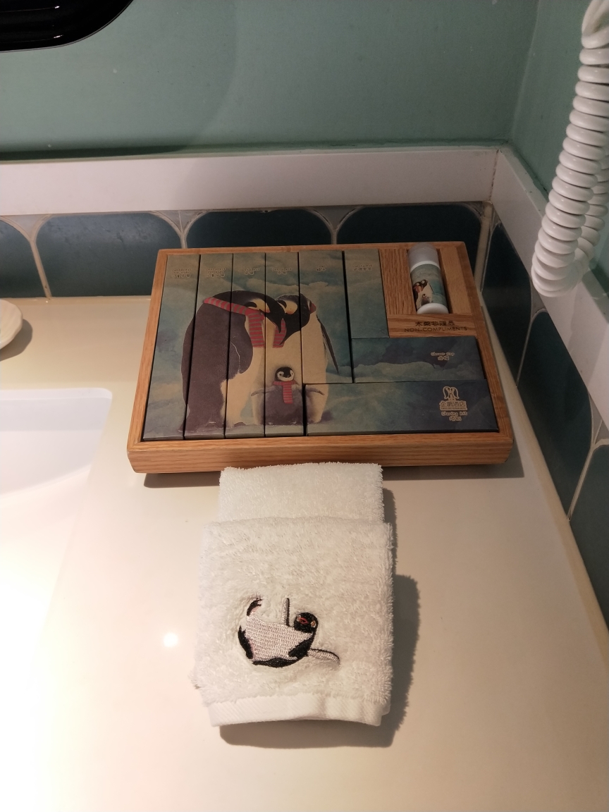 到了企鹅酒店,禾苗的兴奋点瞬间被开启,酒店大堂和房间到处都是可爱的企鹅元素,灯具,床头,牙具,衣架还有儿童座便圈和供孩子洗手踩的小凳子。