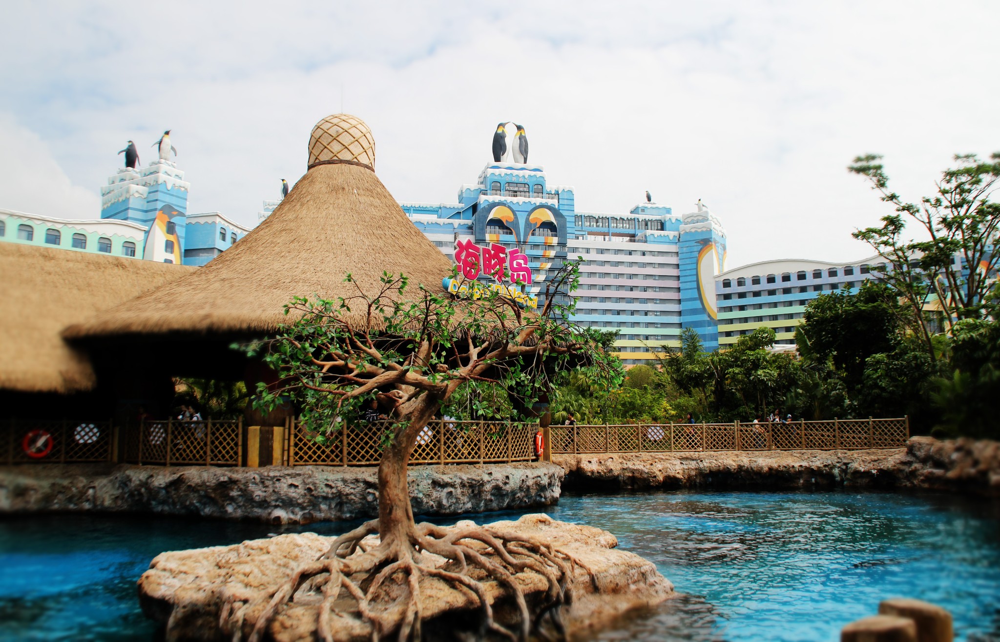一入园经过海洋大街,头顶的天幕做的很炫,先到海豚湾的海豚岛看看海豚,这个角度可以清楚的拍到企鹅酒店。