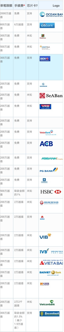 3⃣建议前去越南前在国内先办好相应的银联借记卡,也就是普通的储蓄卡,最好是免境外取现手续费的卡。办哪张卡可以参考银联借记卡,境外 ATM 取现发卡银行手续费一览表。(下图有详细说明表)