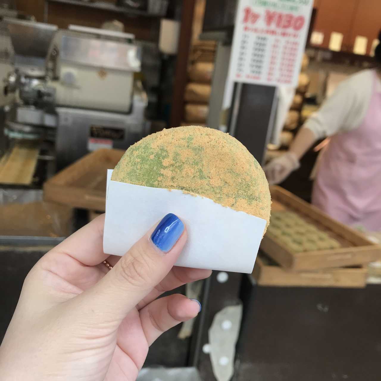 抱着走哪儿算哪儿终点是奈良公园的心态找到了中谷堂,买了红豆麻薯,130日元/个。糯米做成的外皮口感糯糯的,里面的红豆一粒一粒的甜而不腻,惊呼好吃。忍不住想再来一个,不过想到要吃江户川鳗鱼饭还是作罢了。