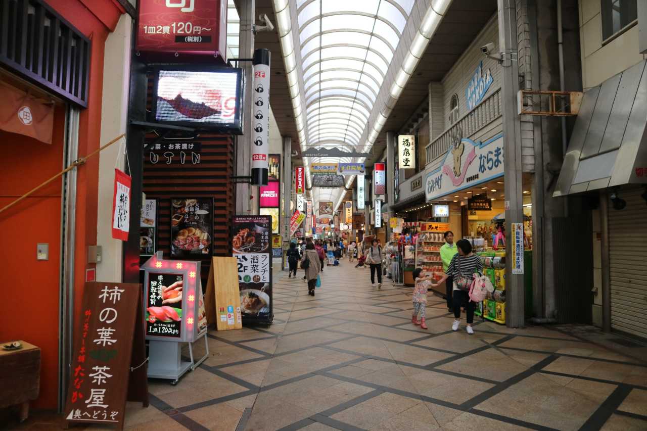 沿三条通一直走,两侧都是商铺。服装、纪念品、餐馆、药妆店,在这条街上应有尽有了。可能我们到奈良比较早,有些店铺还没有开始营业。也想着返回京都的时候还会路过这条街,就没有逛店。
