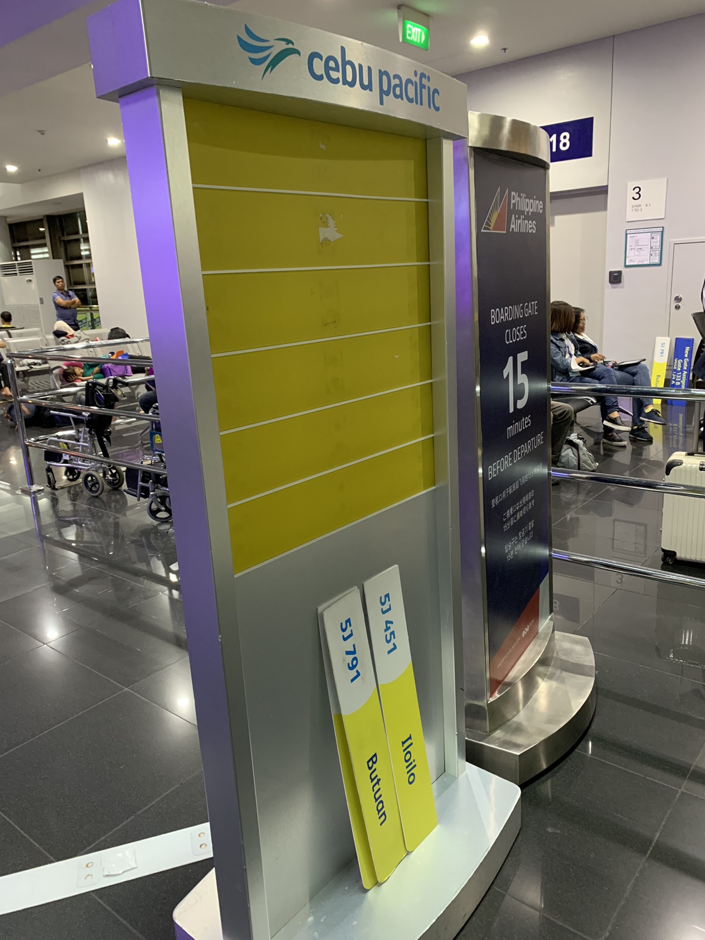 我们提早了45分钟抵达登机口,但登机口正被其他航班(菲律宾航空)占用着,无奈之下,我们坐到一边去继续等,心想飞机肯定晚点了。接着离我们航班起飞时间还有二十多分钟,我们走去问这个登机口的工作人员(菲律宾航空),回答我们不知道!我们再看看这个牌的另一面,不知道啥时候插入了一块写着“reassigned to gate 3B”,这时,有位宿务航空的工作人员出现了,也进一步向我们确认了这个牌的信息是正确,是最新的。