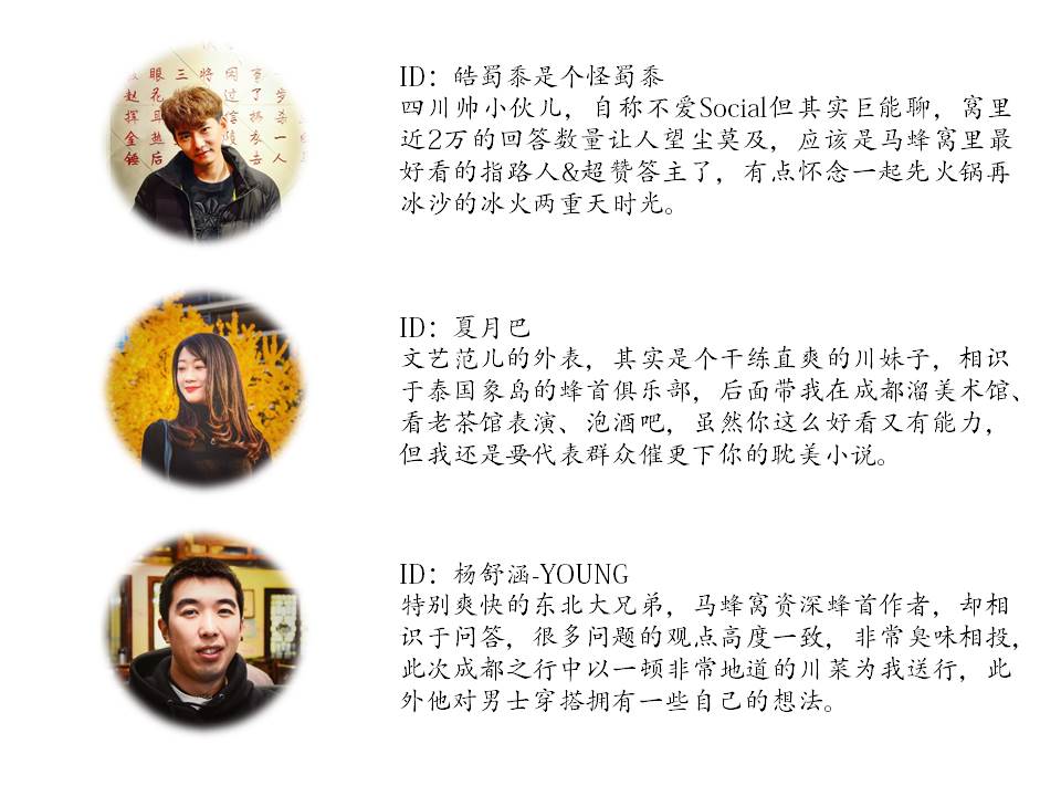 感谢三位朋友在成都的盛情款待,以上ID均为他们的马蜂窝账号,大家快去窝里关注他们哈哈。