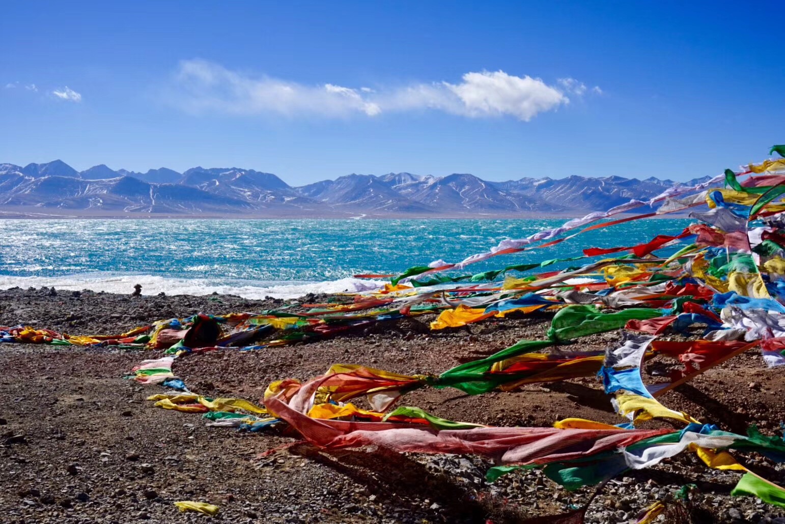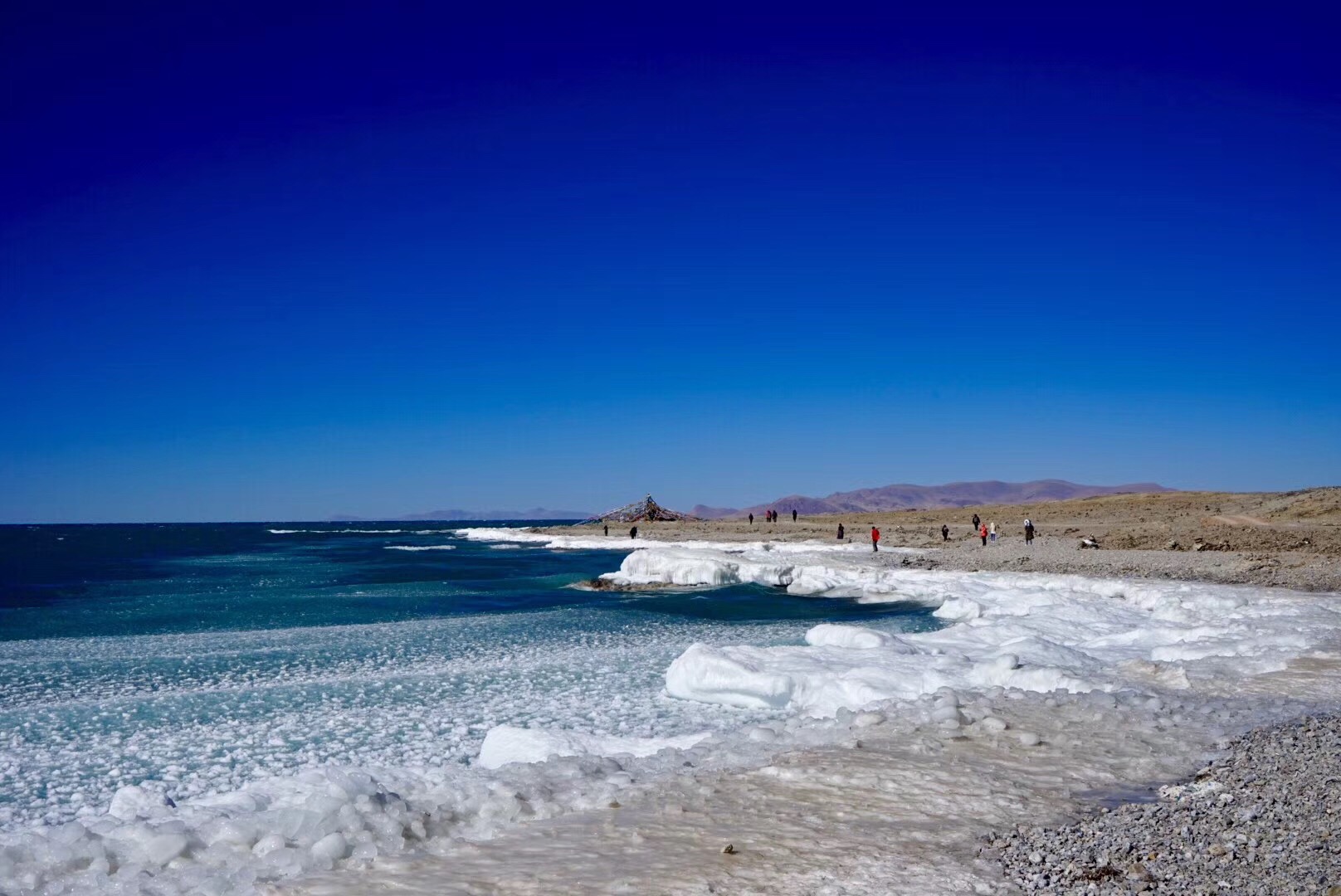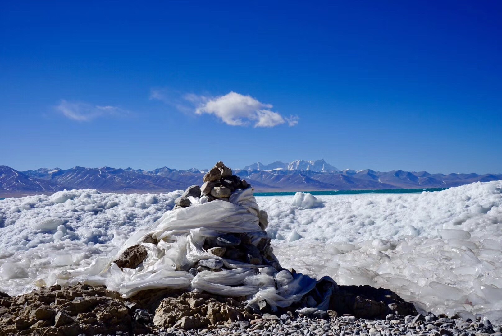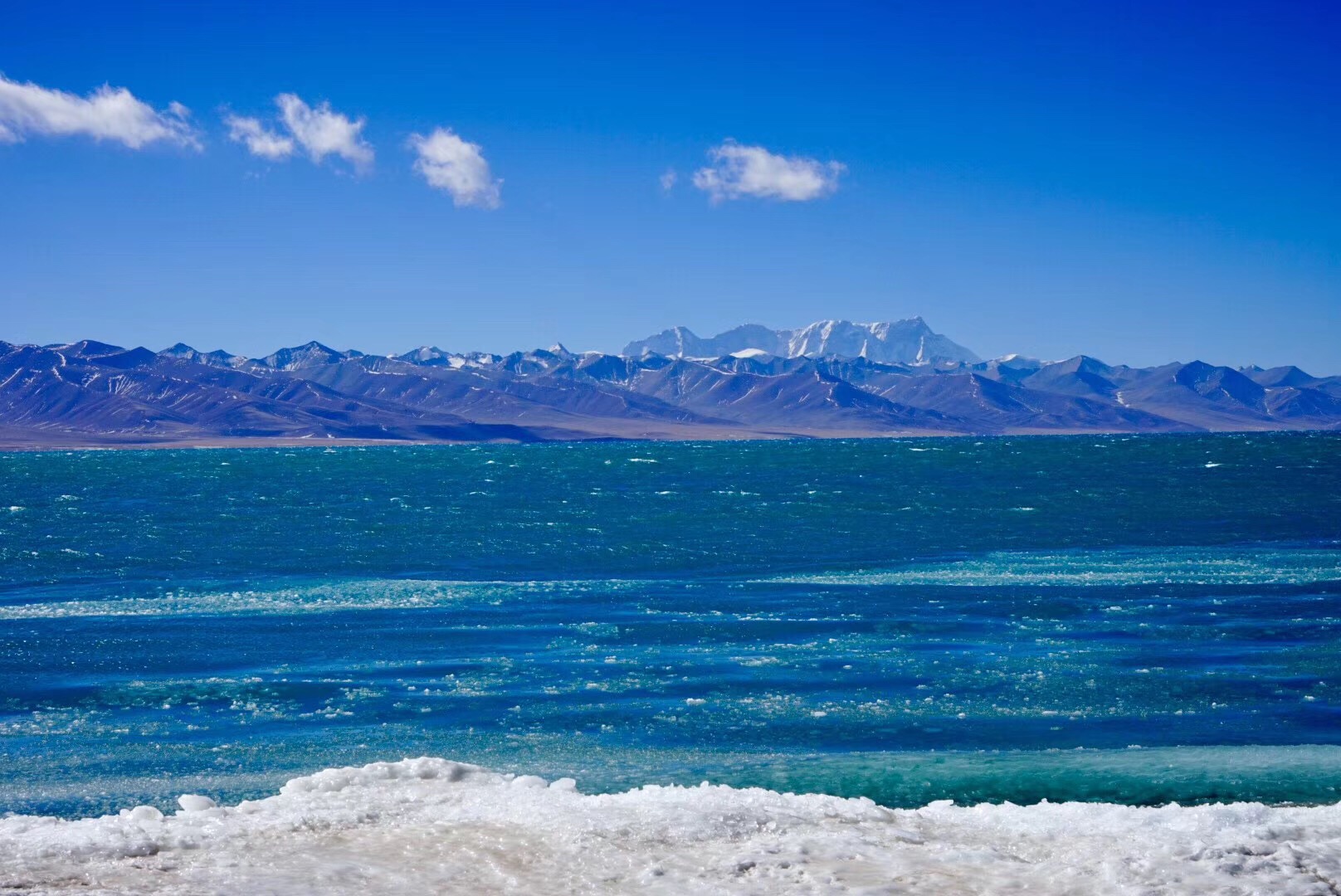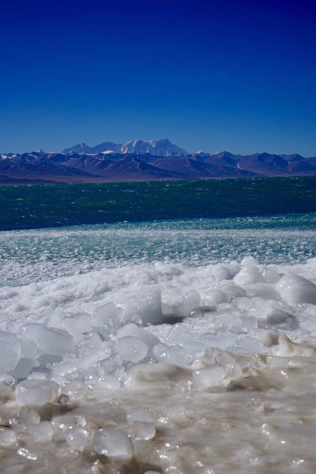 2月4日,报了一个纳木错的一日团,150一人。2月的纳木错居然没有完全封冻,湖中心是碧蓝的湖水,近岸是层层叠叠的冰,远处是默默的念青唐古拉峰。风大到站立不稳,手机被冻死了,路灯沿着湖岸艰难前行。这个时候,天地间,只剩下了湖、山和路灯,突然有些明白了燃犀对纳木错的钟爱。
