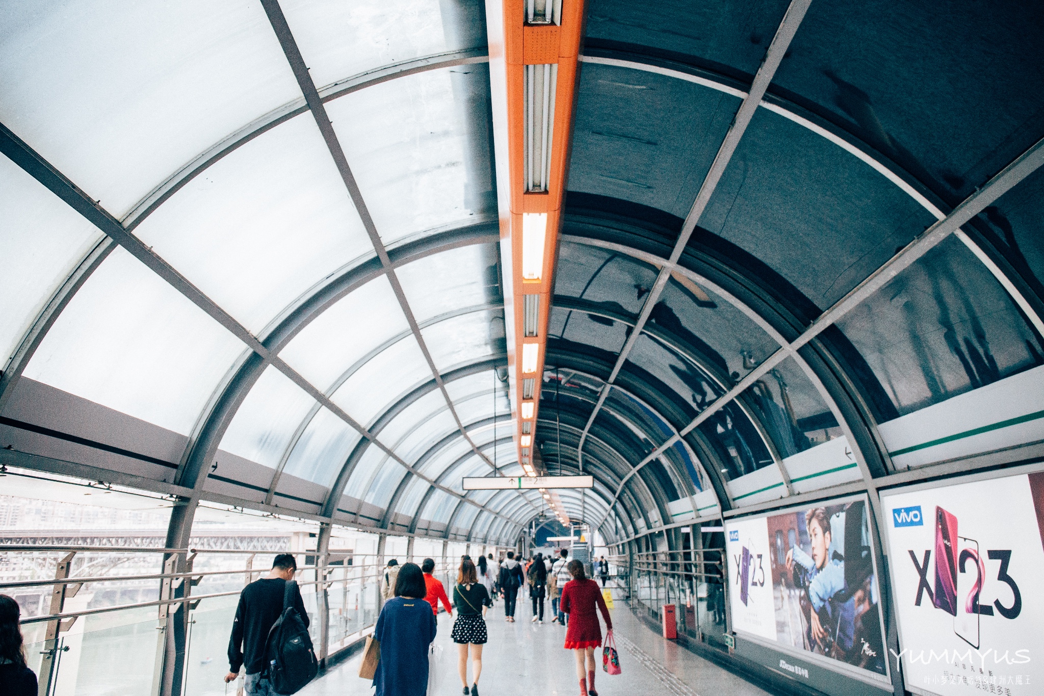 换乘的时候赶紧拍两张照片,可以看出,我们下面这条轻轨线距离地面已经四楼以上,而我们这个位置几乎距离江面有十几层楼了。