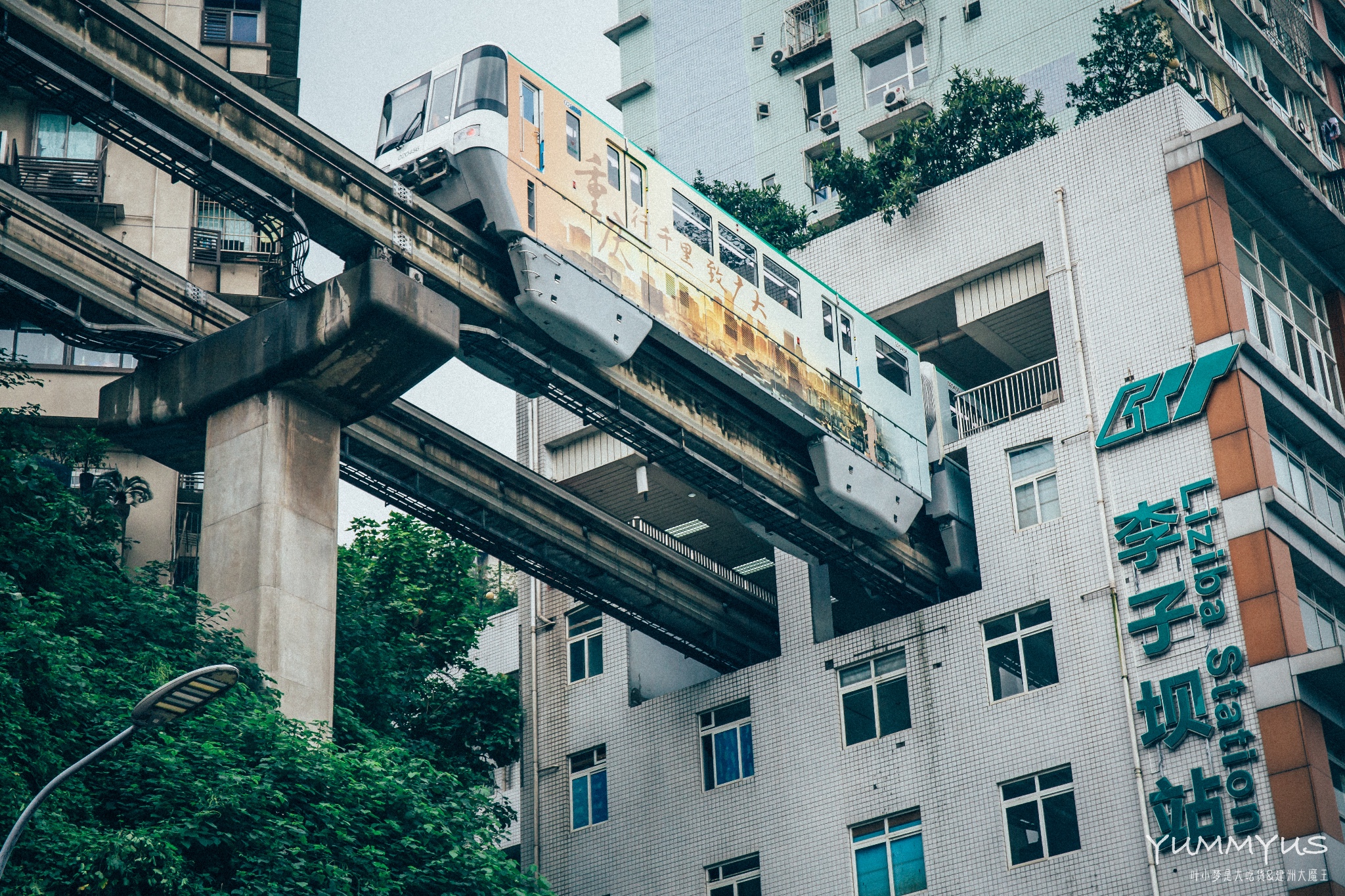 只见轻轨驶过,穿楼而入——算是只有在重庆才能看到的神奇景观吧。