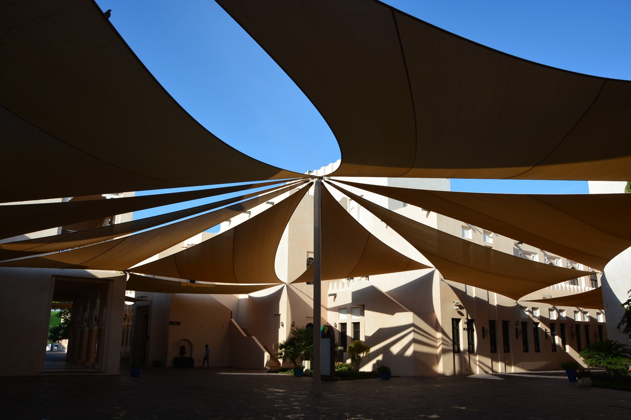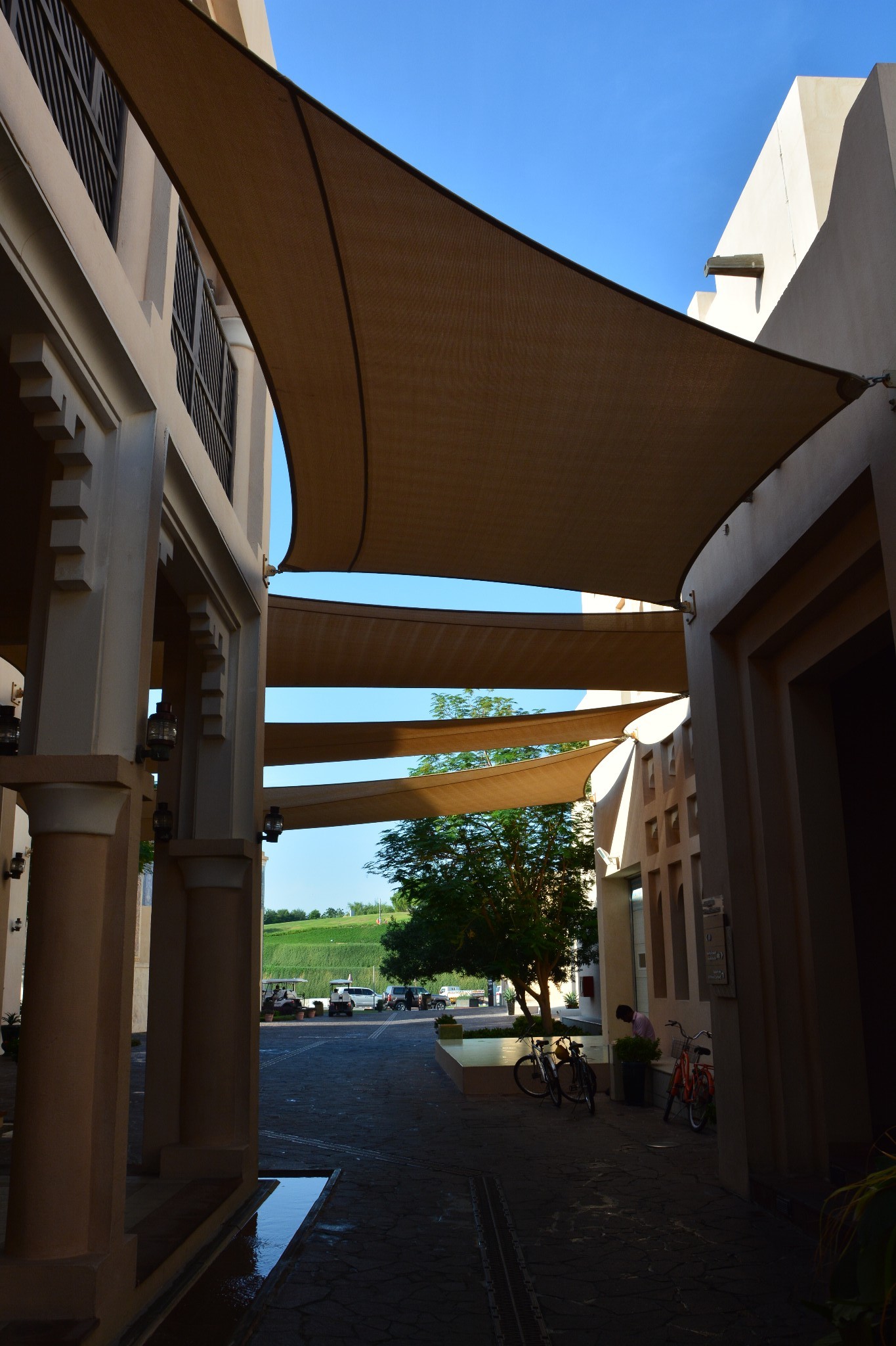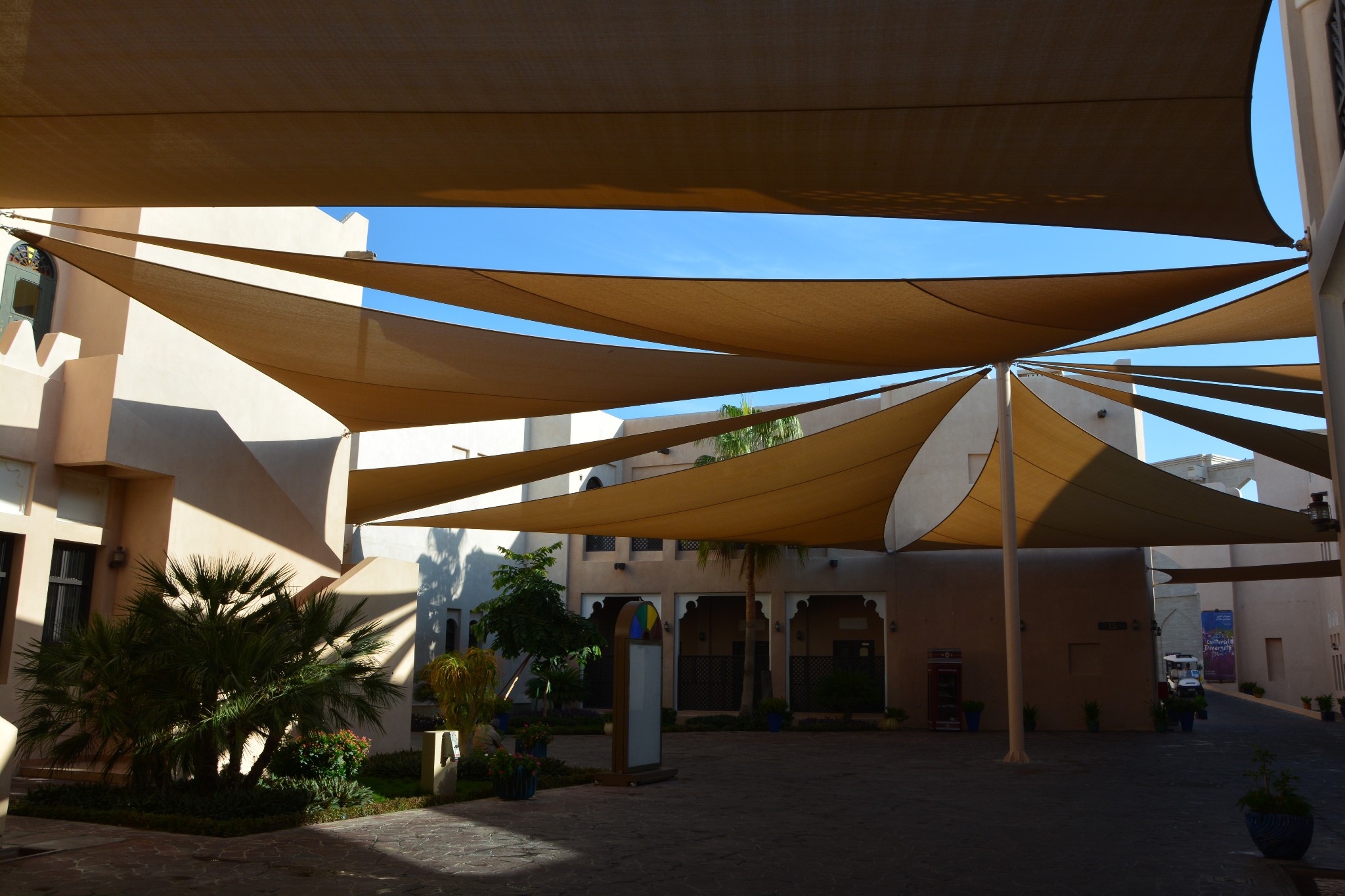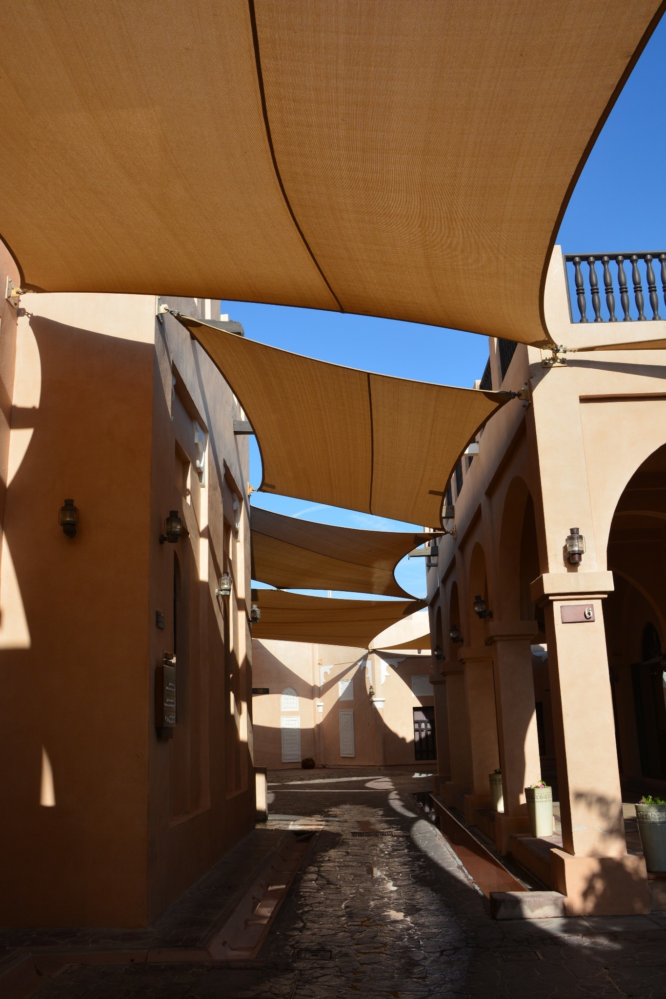 如果只是几栋土黄色的房子,当然没啥意思,可是相连这些房子的小路和广场都被创意来源于阿拉伯三桅船的风帆覆盖,灼热的阳光受到风帆穹顶的阻挡,只能在屋前和街上留下斑驳的光影,有种光怪陆离的美感;村内还建设有环绕房前屋后的漂亮水渠,流水潺潺,花瓣漂浮,清澈见底,水下的鹅卵石或黑或白,黑白相间,简约而大气,许多角落里还设置了饮水龙头,打开便可直饮,绝对不用为了饮水安全而担心。