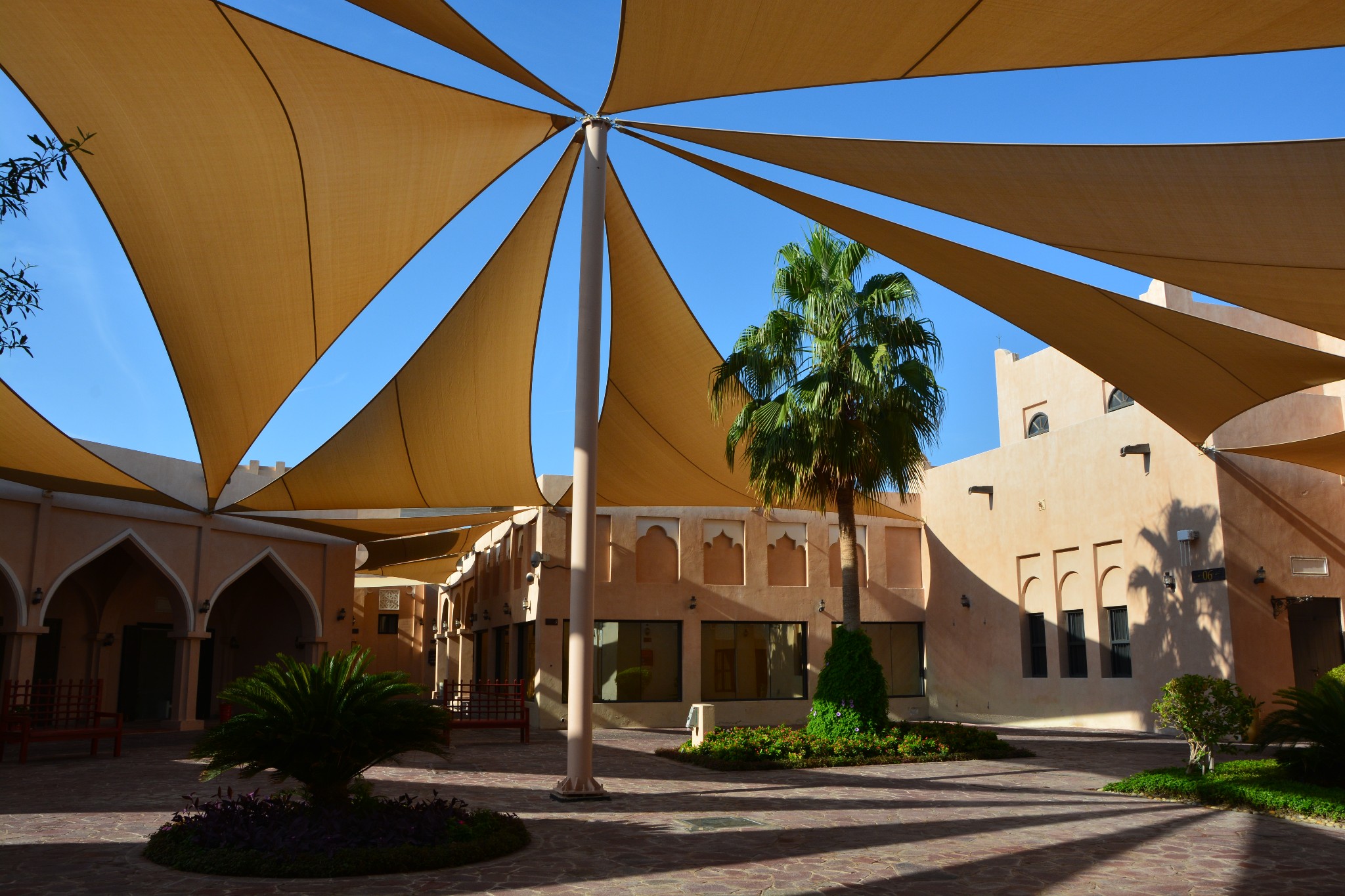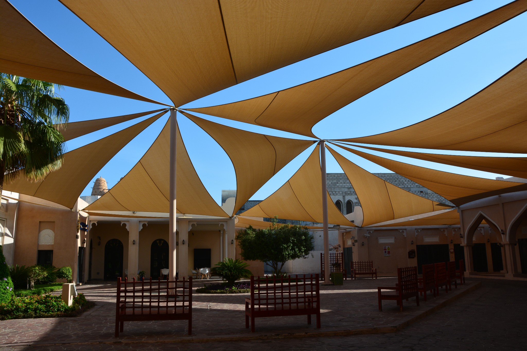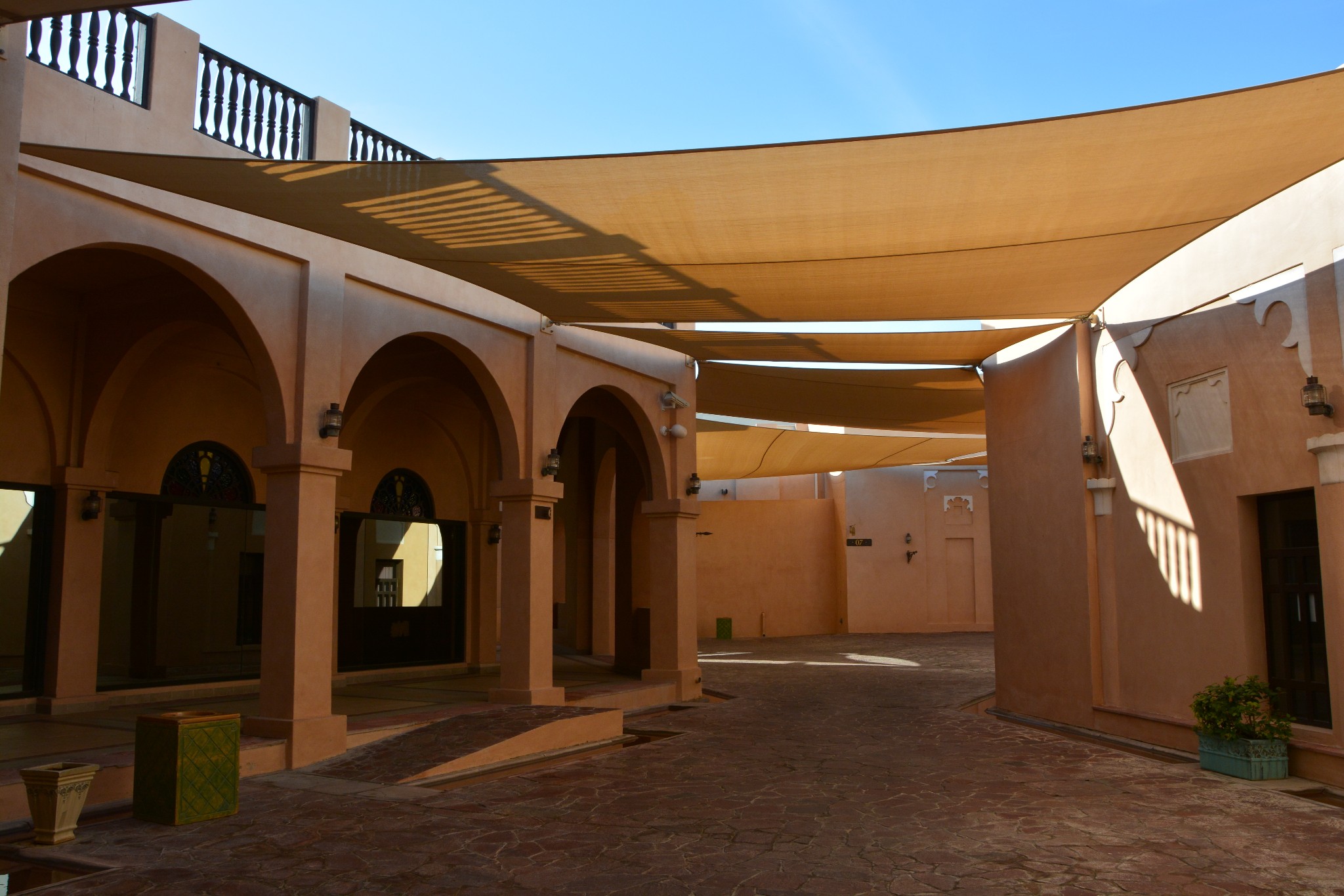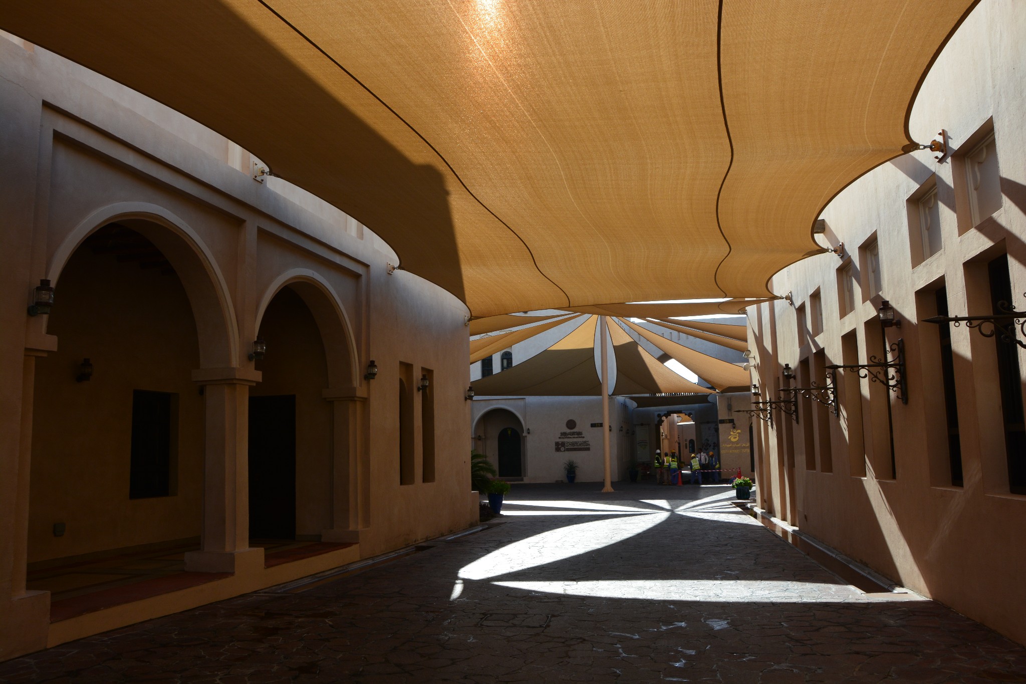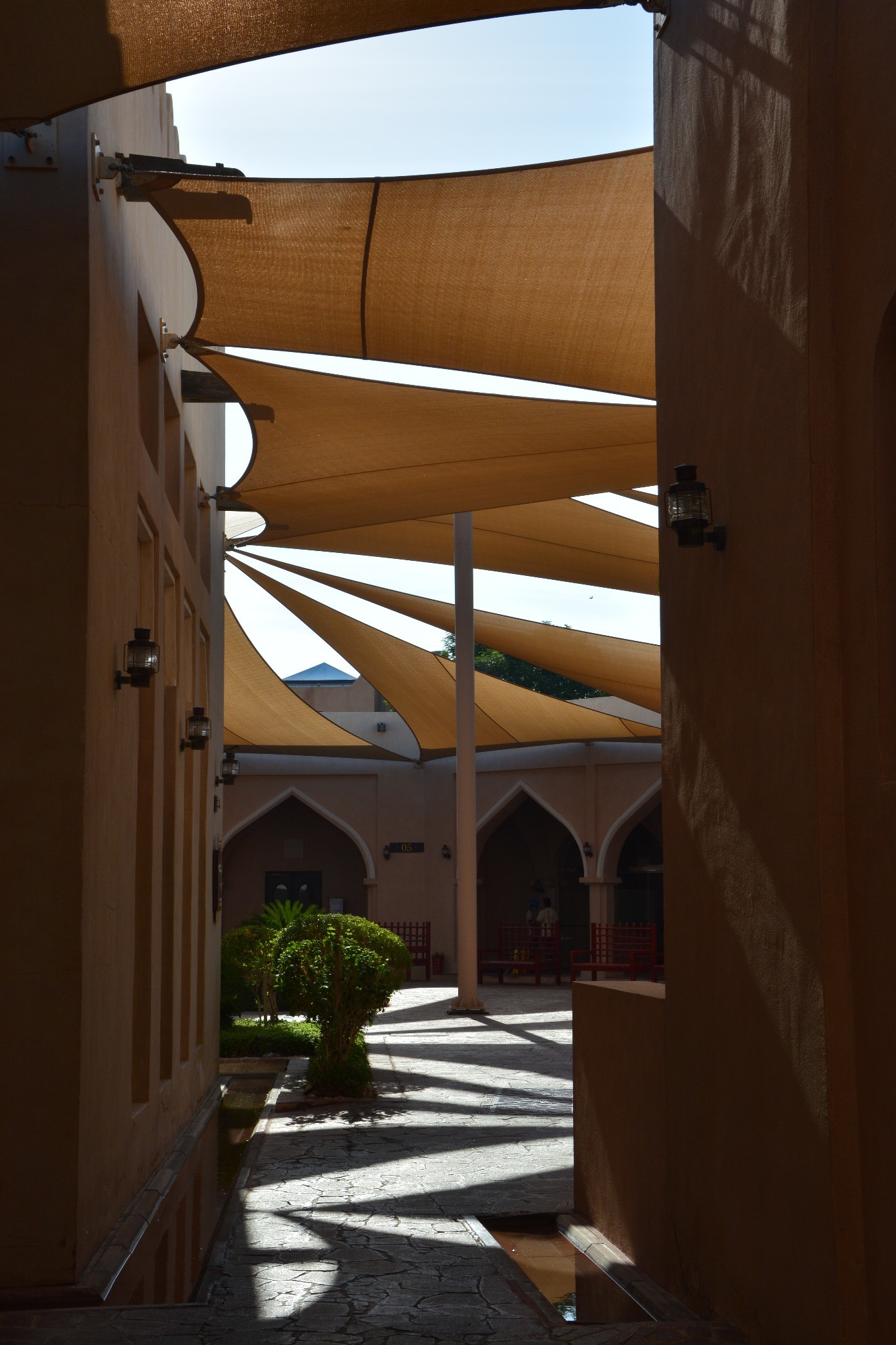 如果只是几栋土黄色的房子,当然没啥意思,可是相连这些房子的小路和广场都被创意来源于阿拉伯三桅船的风帆覆盖,灼热的阳光受到风帆穹顶的阻挡,只能在屋前和街上留下斑驳的光影,有种光怪陆离的美感;村内还建设有环绕房前屋后的漂亮水渠,流水潺潺,花瓣漂浮,清澈见底,水下的鹅卵石或黑或白,黑白相间,简约而大气,许多角落里还设置了饮水龙头,打开便可直饮,绝对不用为了饮水安全而担心。