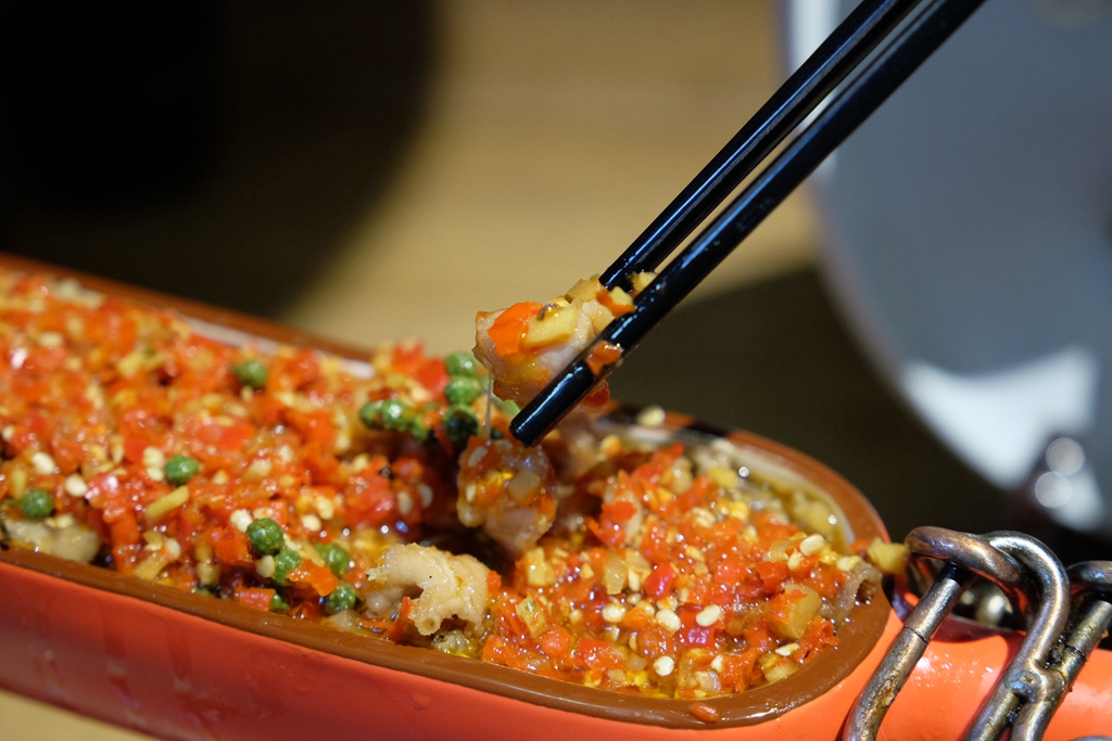 点了几样招牌菜中,纸上焗鲜鲍的辣味程度是最低的,因为有面条的加入,所以我将它视为一道主食,如果你来成都吃客想垫饱肚子,那么这道加入鲍鱼、蟹肉棒的纸上焗鲜鲍是上好的选择,它的汤汁鲜甜不辣。虽说来成都就是要尝尝辣的美味,但对我这个日常少吃辣的福建人来说,有这么一道几乎不辣的特色菜,简直一场“及时雨”。