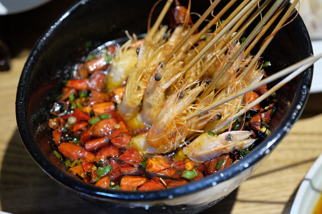 为何叫裸奔坨坨虾呢?当菜端上来我就知道了。原来厨师在做这道菜的时候已经把虾壳已经剥去,名副其实的“裸奔”,哈哈。在福建,虾一般就是蒸熟了,在蘸这酱油醋来吃,而成都吃客则以麻辣串的形式呈现,吃起来别有风味。