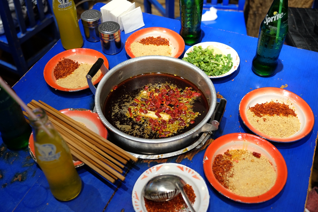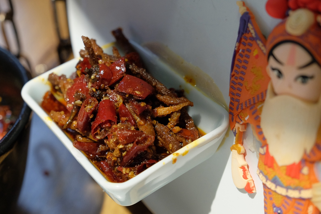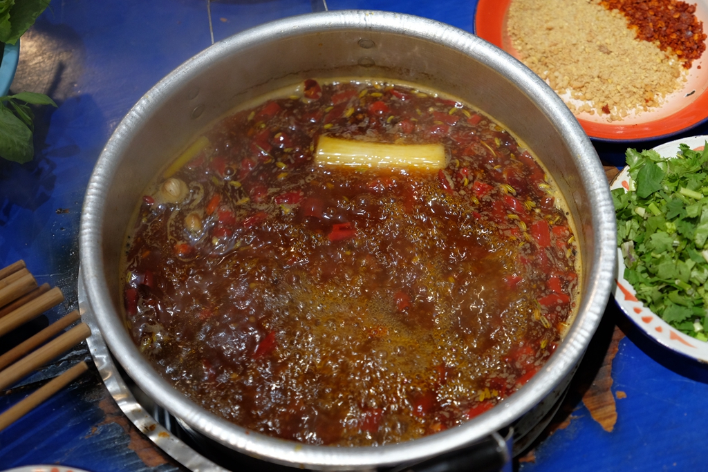 点了一份经典锅底,配了加入黄豆面的干海椒碟。冒着香气的汤锅闻上去应该挺辣的,小伙伴说这里的锅底是可以选择微辣和辣,但我的眼中只有辣和很辣之分。虽然我一再强调我是个不怎么敢吃辣的福建人,但是来到成都不潇洒辣一回,我都不会原谅自己的。