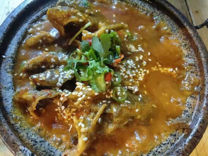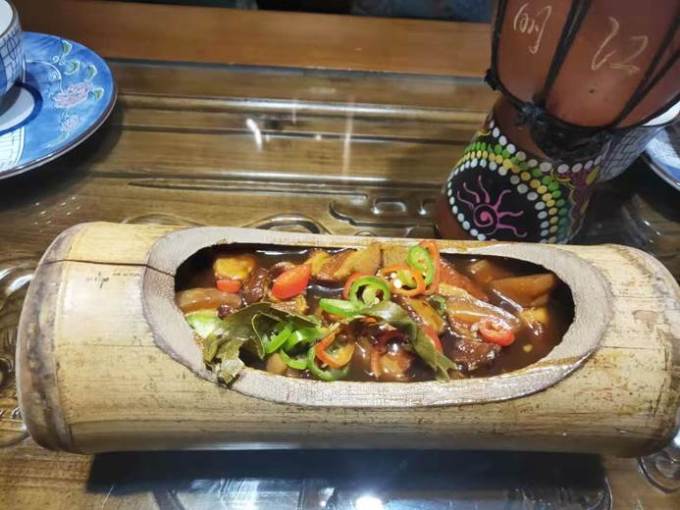 闺蜜喜饮茶,我们便点了一道茶马古道之普洱茶红烧肉。吃到这道菜,感觉茶香和肉香简直是绝配,甚至连我这种不怎么饮茶的人都被完全征服了。感觉入嘴的确让人联想到茶马古道的情景。普洱茶的清香完美地融入到红烧肉的汤汁里,使得红烧肉的口感变得滑而不腻,甚至很清爽。我俩都爱吃排骨,便点了一道丽江干香腊排骨。这是丽江招牌特色美食之一,它是纳西名菜三叠水的第三叠,三叠水,等同于纳西人的满汉全席,只有宴请最尊贵的客人才上此菜。相传当年徐霞客游历丽江,纳西土司就曾用108道"三叠水"来款待他。这道菜用的排骨极好,肉质鲜美,怪不得是特色呢。然后我们还点了老酸奶,上面还有坚果碎和花瓣作为装饰,很满足我们的少女心。