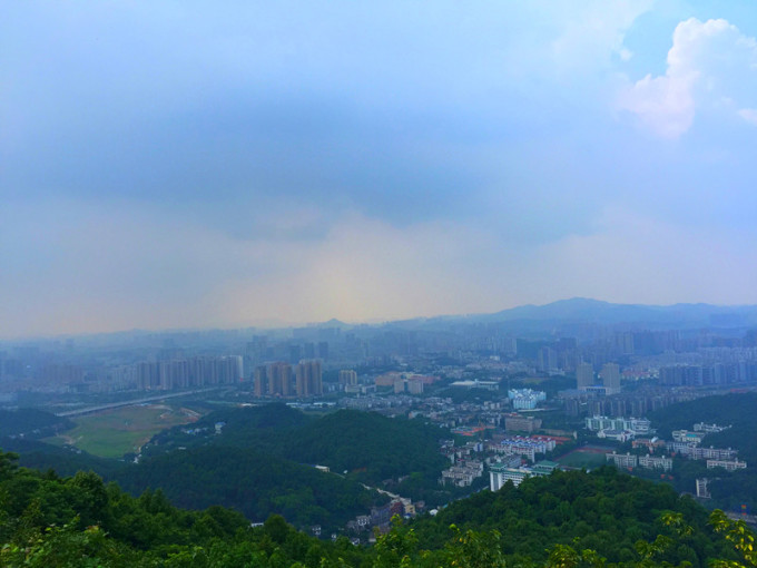 山顶俯视的感觉很美,蓝天白云,红瓦绿树,尽收眼底。