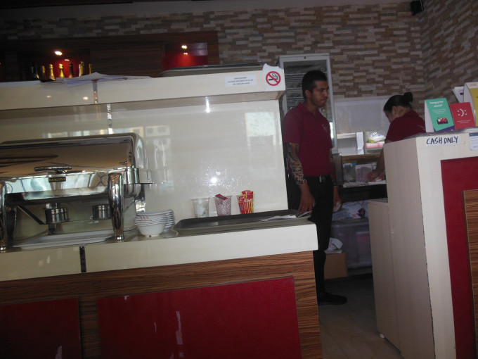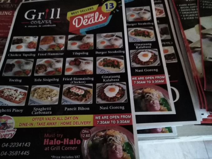 服务员递过来菜单。图片上的每份都是13迪拉姆。同学跑进厨房去看了,里面没有爆炒煮,全是电器。