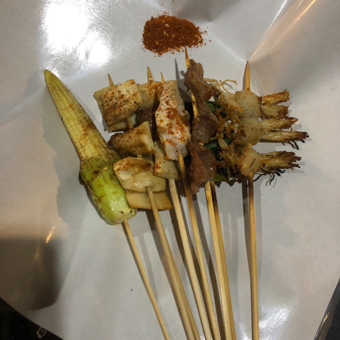 晚上回去后饿得不行 本打算晚上回去就吃在711买的零食 结果回去发现在路口有一家烧烤店 味道还不错 总共45铢
