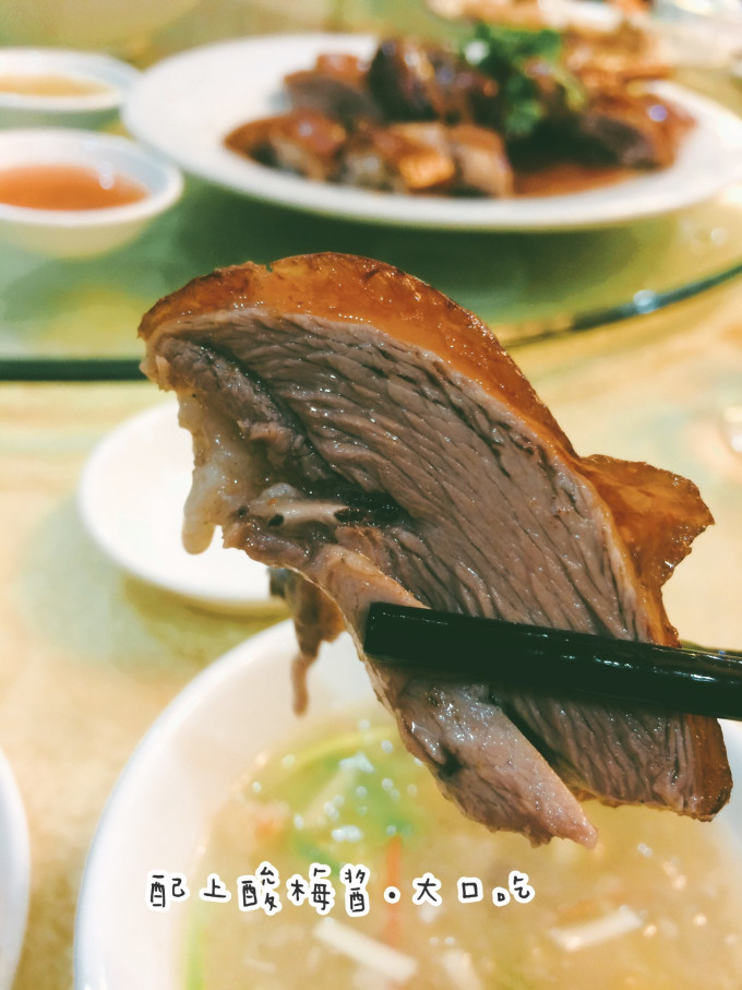 招牌烧鹅,每桌要了半只烧鹅,上菜时还热的,皮很薄,肉不肥,配上酸梅酱,超正!