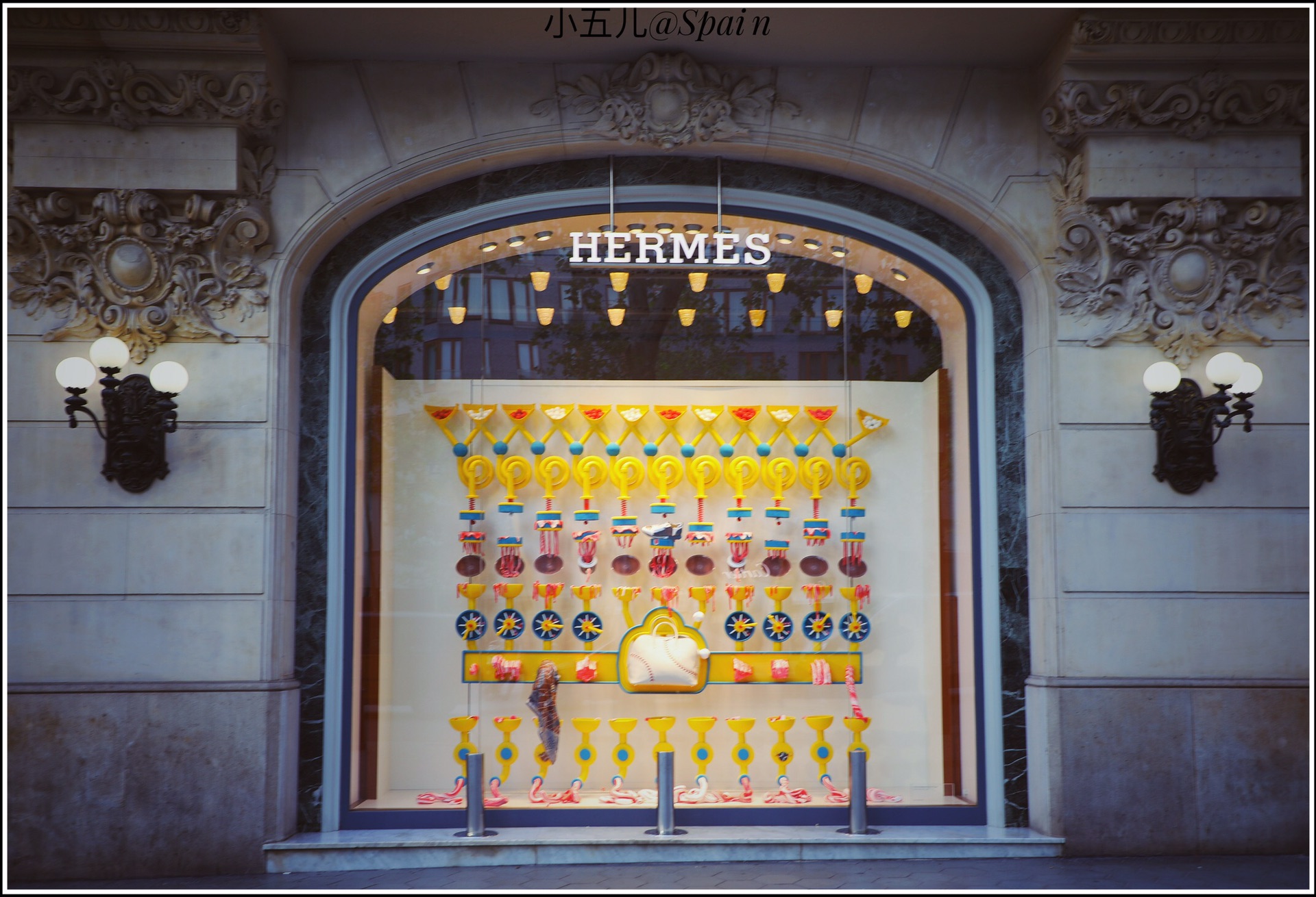 我们住在巴塞罗那最著名的格拉西亚大道靠近恩典区的尽头,距离米拉之家步行300米左右,早上8点,我们沿着格拉西亚大道一路向加泰罗尼亚广场方向步行,街道两侧都是世界著名品牌的店面,路过爱马仕的橱窗觉得很有意思,随手拍了一张。