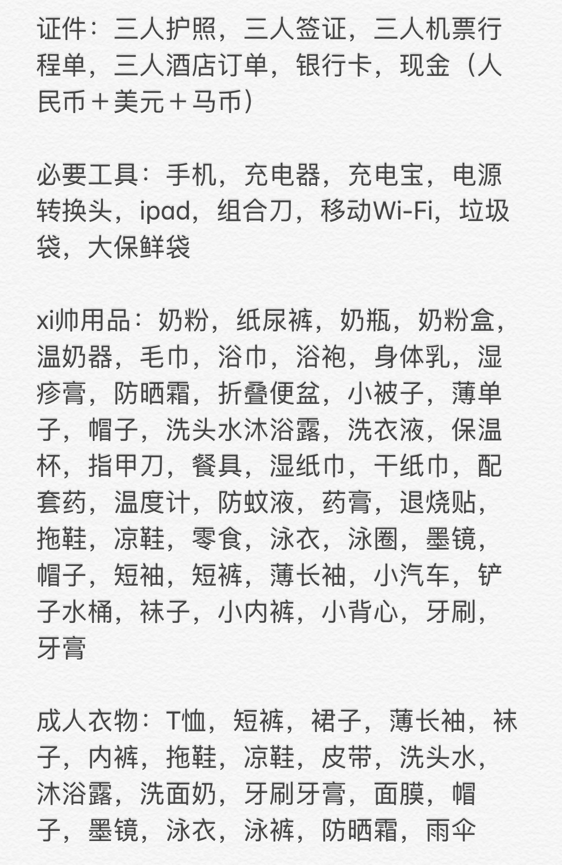 这个是我出行前自己做的准备清单,当然是只能仅供参考,具体的可能还是要根据自身情况去准备啦!我孩子比较小,所以我觉得有些东西还是有必要的,例如折叠小马桶,折叠衣架,温奶器,而且我们到那的第一天给我儿子买了一个大盆,因为我儿子不爱站着洗澡,第一家的酒店没有浴缸。每次带他出去,去哪都要买个盆,然后再送人,真心觉得浪费,啥时候折叠盆能设计的放入行李箱,我一定第一个购买。。。因为我们是广州转机,我很担心行李会丢,所以拿了一个28的大箱子和一个20的登机箱,里面装的全是孩子的东西。但是,我下次绝对不这样了,因为酒店后面的曙光商场什么都有,mothercare都有,到那直接买就好,别跟我似的累的要死。