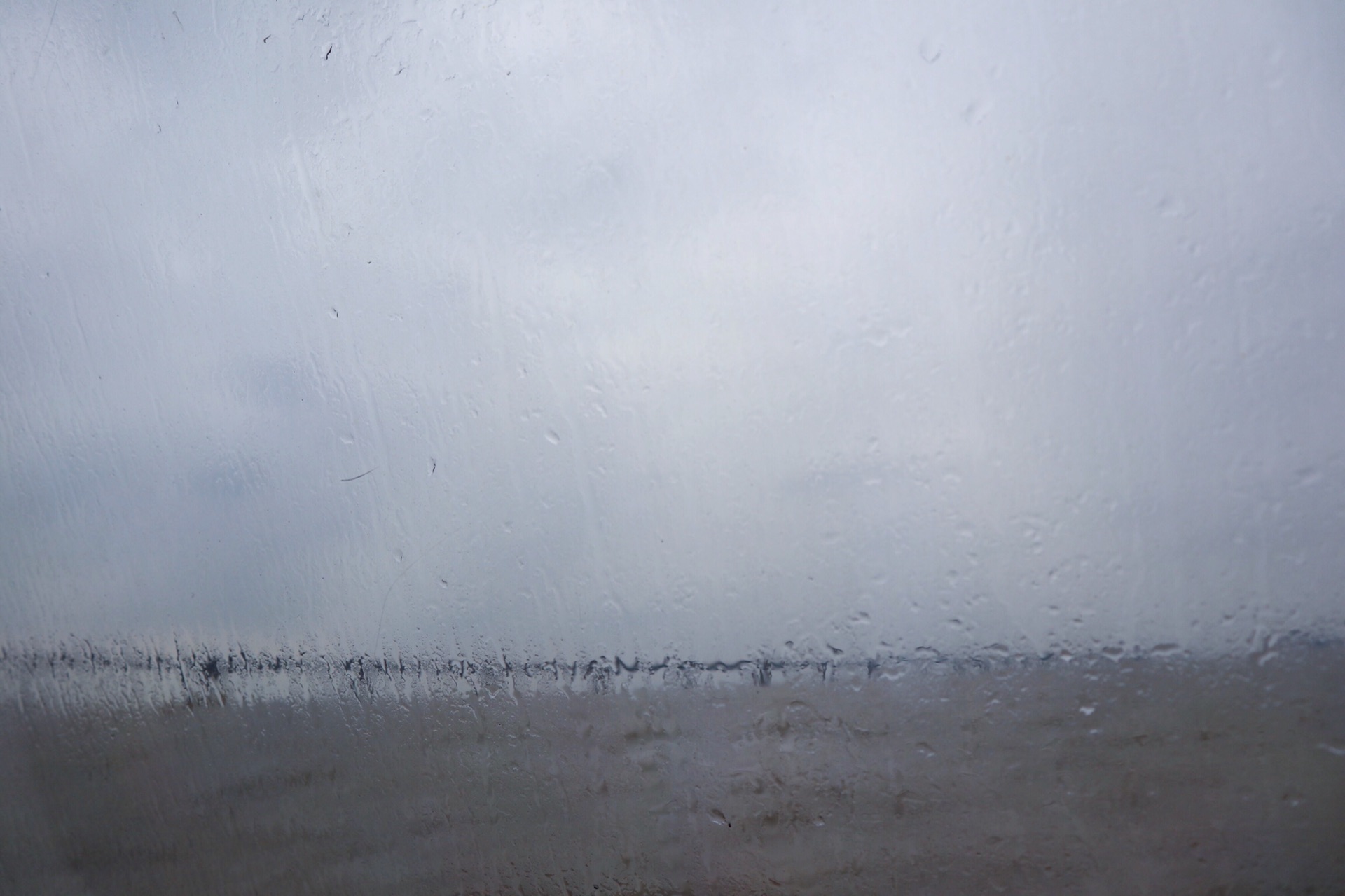 ·海浪比较大,窗户被海浪打湿,沾满小水滴。模模糊糊的穿过传说中的港珠澳大桥。