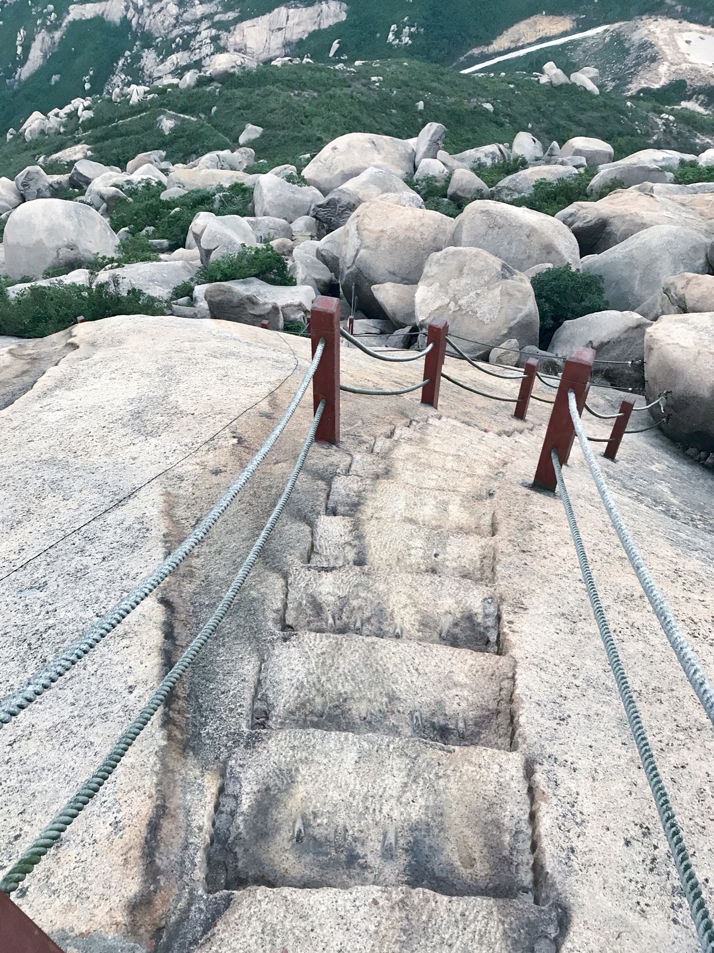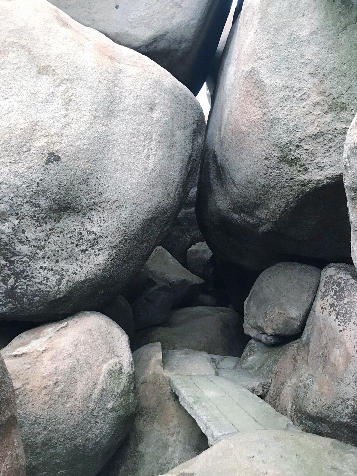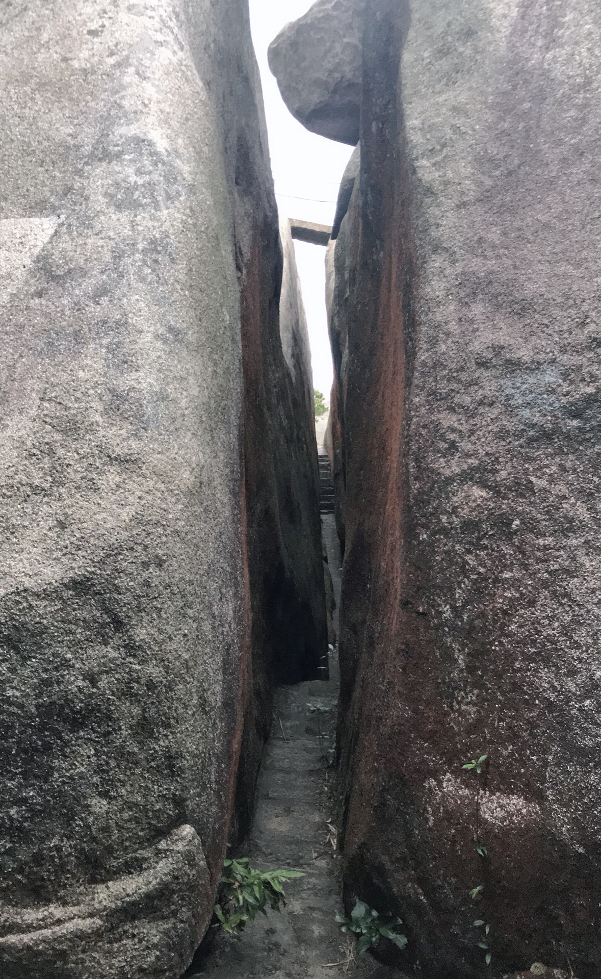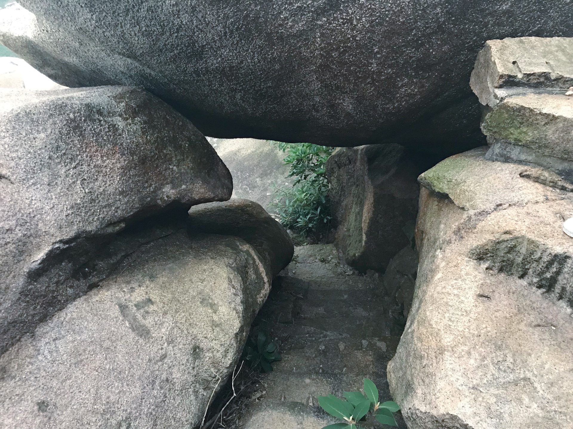 从一开始被千奇百怪的狭窄石缝,陡峭石阶所感到惊奇,到下山时在半山腰发现路被大石阻断和天色慢慢暗下来,两个人措手不及,恐慌的原路返回。途中遇见那对刚好也迷路的情侣。得知情况后情侣也逼不得已一起往回走。
