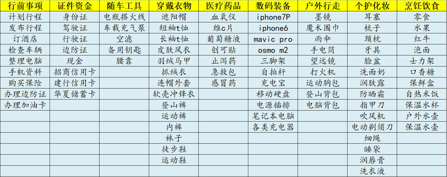 这些准备物资我删了又改,改了又删,最终决定带这些物品,虽然有些东西最后也没用上,但是有备无患,图个安心