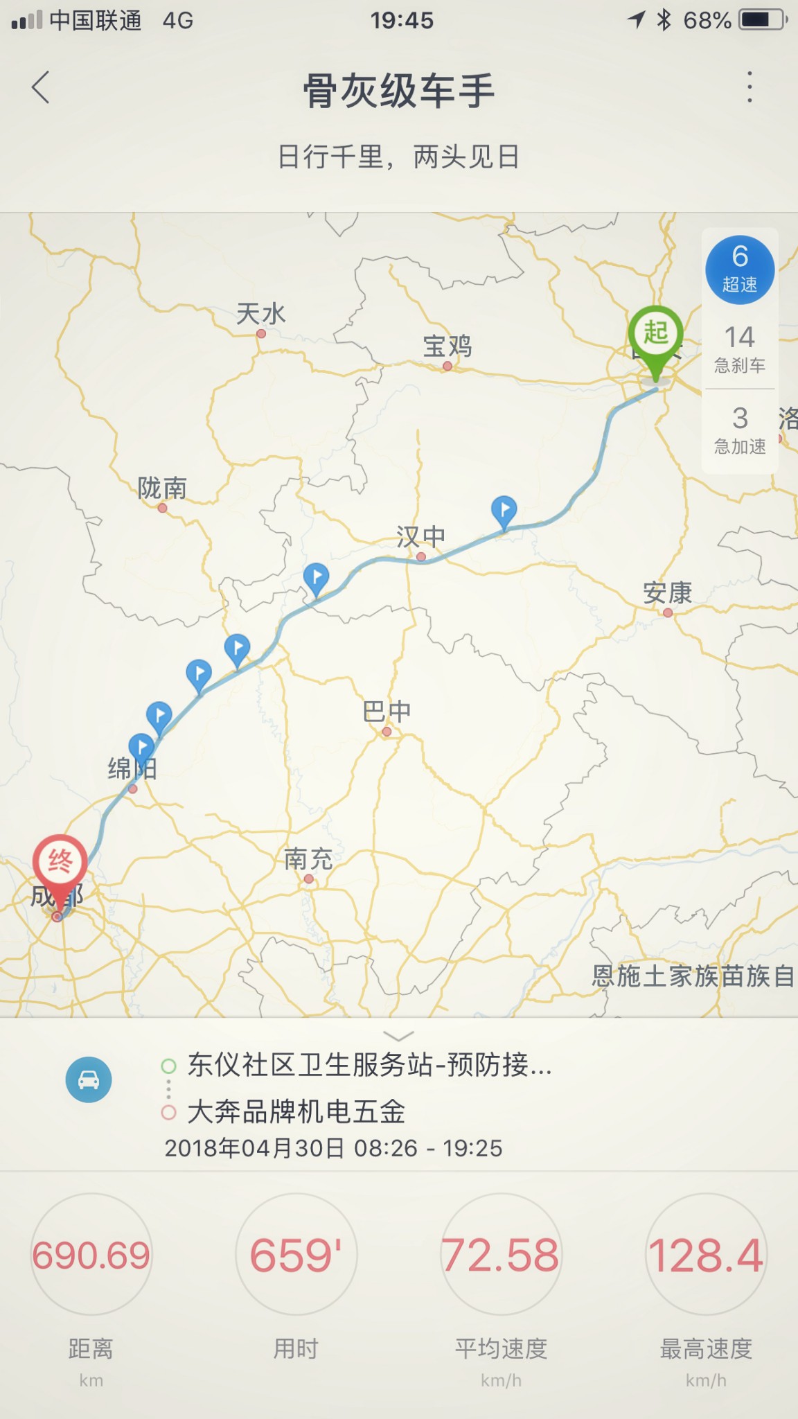 晚上七点多顺利到达成都,一箱油跑了七百公里,一个是这车确实省油,再一个就是从西安到成都貌似好多路都是下坡