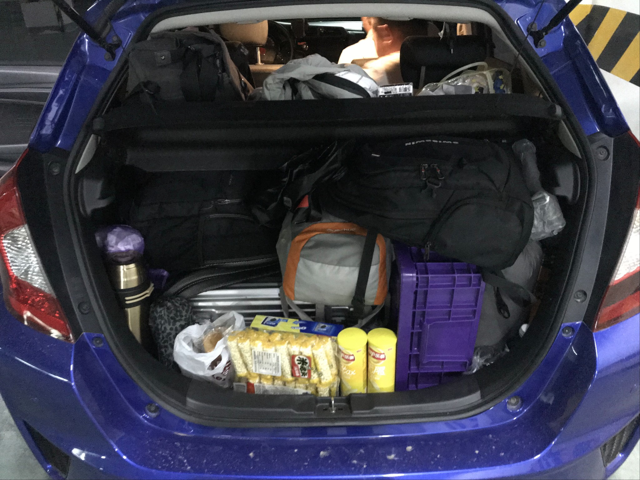 行程的第三天也就是5月1日,同时也是劳动节,早上起来后把后备箱重新归置了一下,这次出来吃的带的有些多,紫色箱子里全是吃的,士力架买多了,到现在家里还有