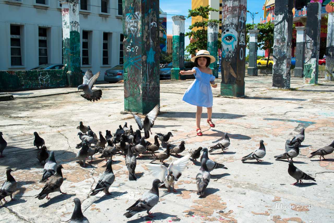 商场对面有一片废墟,还有点涂鸦,小家伙就拿飞机上带下来的面包喂了鸽子。