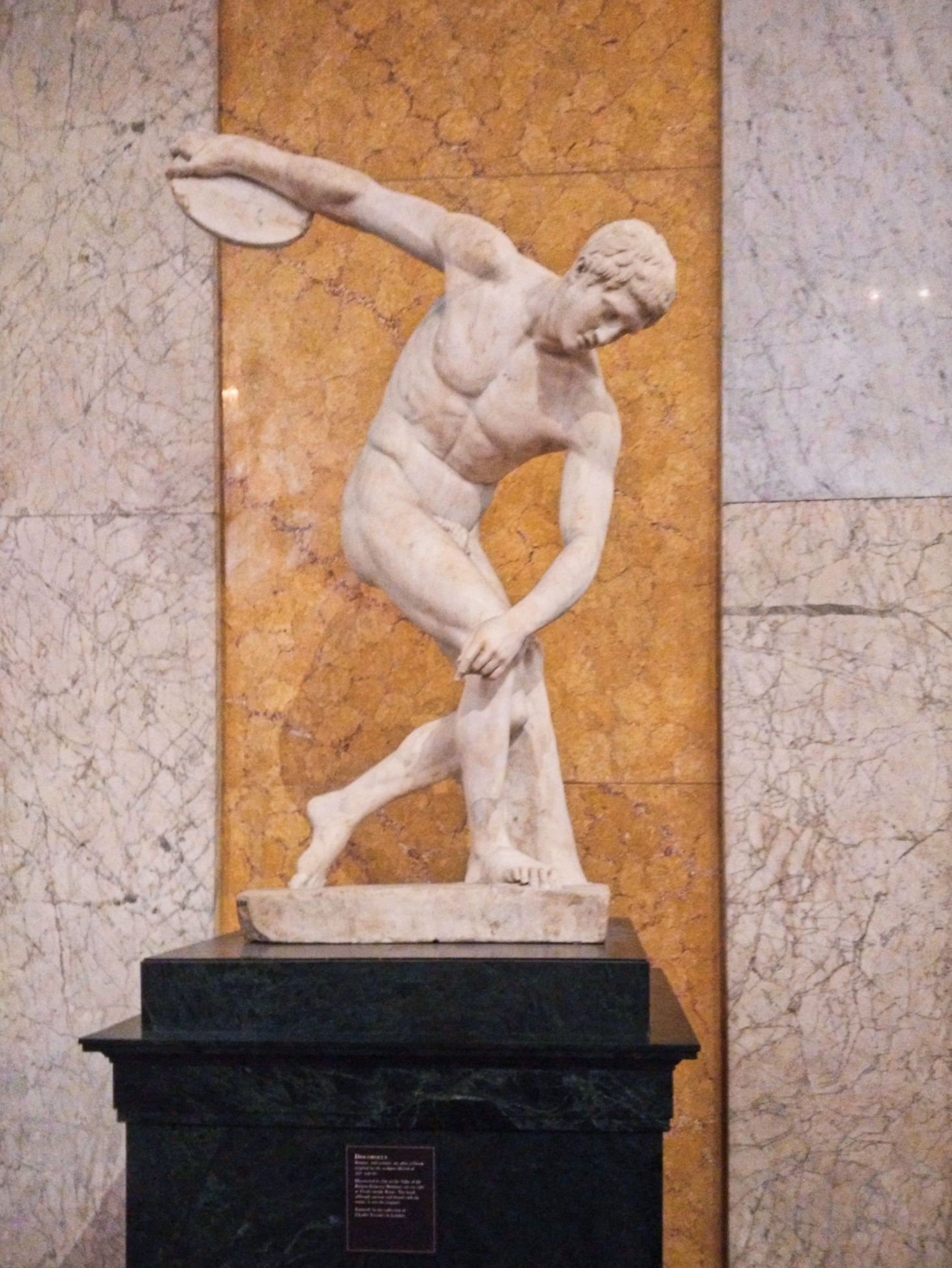 《掷铁饼者》是希腊雕刻家米隆于约公元前450年雕刻的青铜雕塑,原作已遗失。公元2世纪时,崇尚古希腊文明的罗马皇帝命人重造“掷铁饼者”,这才有了留存于世的三座复制版,分别存放在那不勒斯、罗马和伦敦大英博物馆。
